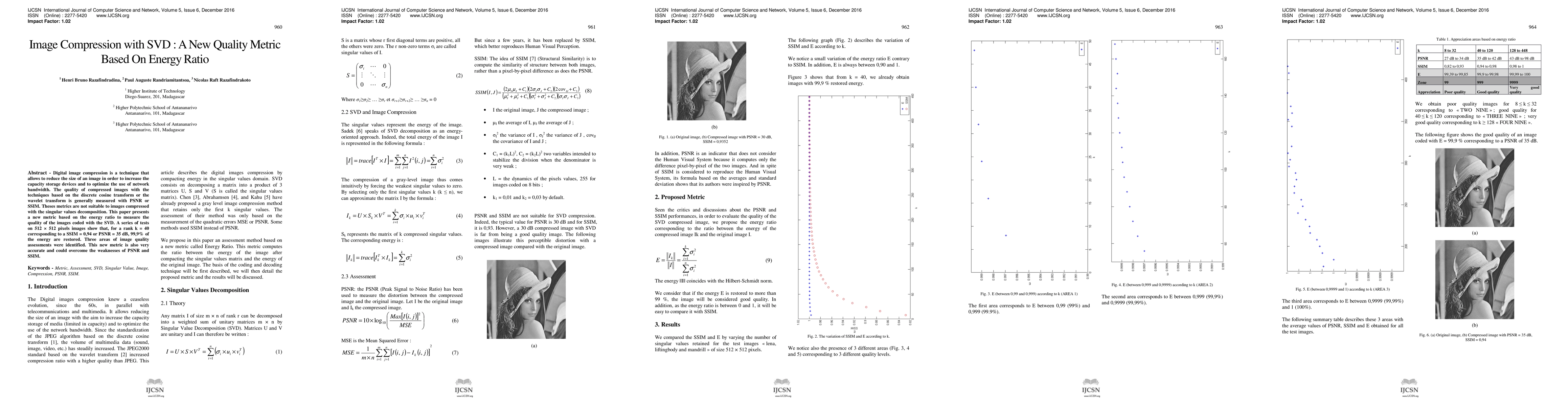 A new image compression metric based on energy ratio is proposed to measure the quality of images compressed with SVD, achieving 99.9% energy restoration for a specific rank k.