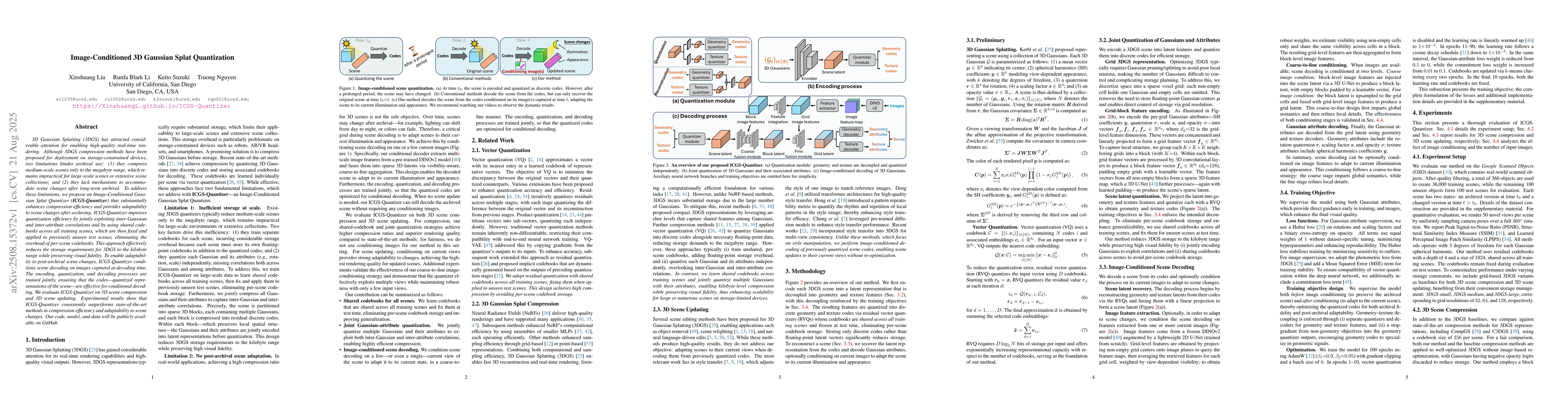 3D Gaussian Splatting (3DGS) has attracted considerable attention for enabling high-quality real-time rendering. Although 3DGS compression methods have been proposed for deployment on storage-constrained devices, two limitations hinder archival use: (1) they compress medium-scale scenes only to the megabyte range, which remains impractical for large-scale scenes or extensive scene collections; and (2) they lack mechanisms to accommodate scene changes after long-term archival. To address these limitations, we propose an Image-Conditioned Gaussian Splat Quantizer (ICGS-Quantizer) that substantially enhances compression efficiency and provides adaptability to scene changes after archiving. ICGS-Quantizer improves quantization efficiency by jointly exploiting inter-Gaussian and inter-attribute correlations and by using shared codebooks across all training scenes, which are then fixed and applied to previously unseen test scenes, eliminating the overhead of per-scene codebooks. This approach effectively reduces the storage requirements for 3DGS to the kilobyte range while preserving visual fidelity. To enable adaptability to post-archival scene changes, ICGS-Quantizer conditions scene decoding on images captured at decoding time. The encoding, quantization, and decoding processes are trained jointly, ensuring that the codes, which are quantized representations of the scene, are effective for conditional decoding. We evaluate ICGS-Quantizer on 3D scene compression and 3D scene updating. Experimental results show that ICGS-Quantizer consistently outperforms state-of-the-art methods in compression efficiency and adaptability to scene changes. Our code, model, and data will be publicly available on GitHub.