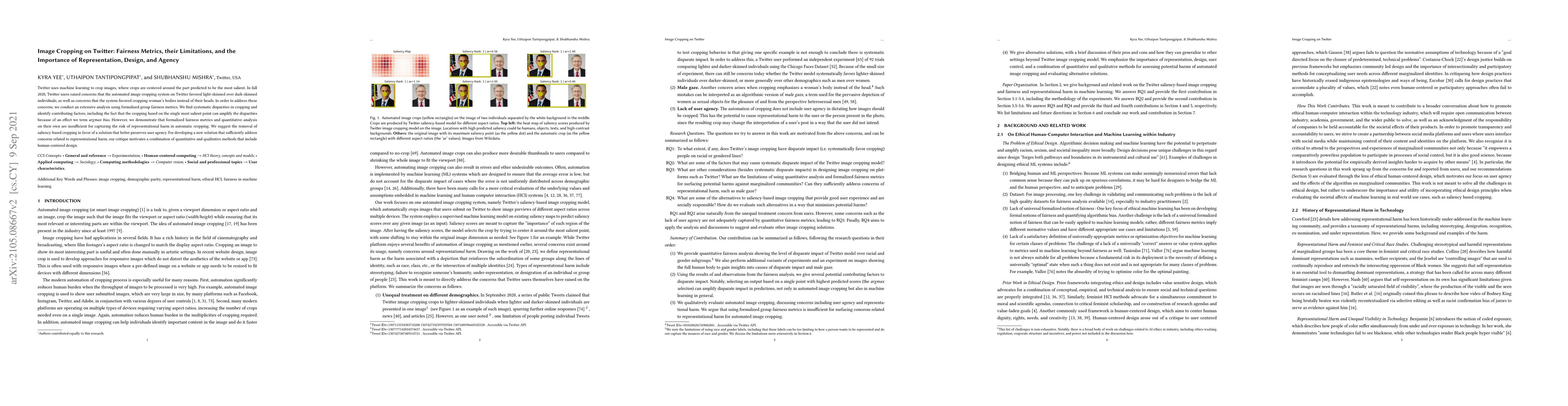 Twitter uses machine learning to crop images, where crops are centered around the part predicted to be the most salient. In fall 2020, Twitter users raised concerns that the automated image cropping system on Twitter favored light-skinned over dark-skinned individuals, as well as concerns that the system favored cropping woman's bodies instead of their heads. In order to address these concerns, we conduct an extensive analysis using formalized group fairness metrics. We find systematic disparities in cropping and identify contributing factors, including the fact that the cropping based on the single most salient point can amplify the disparities because of an effect we term argmax bias. However, we demonstrate that formalized fairness metrics and quantitative analysis on their own are insufficient for capturing the risk of representational harm in automatic cropping. We suggest the removal of saliency-based cropping in favor of a solution that better preserves user agency. For developing a new solution that sufficiently address concerns related to representational harm, our critique motivates a combination of quantitative and qualitative methods that include human-centered design.