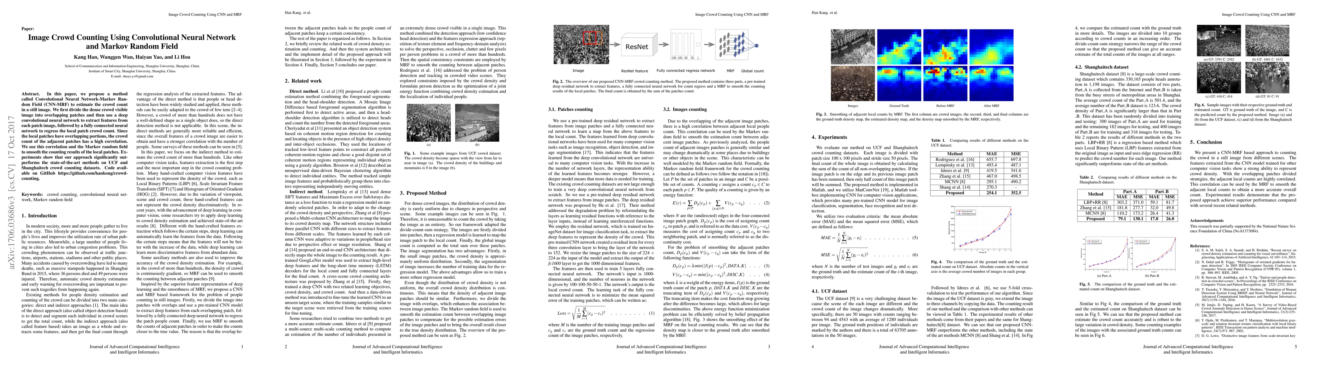 This paper introduces a CNN-MRF method for crowd counting in images, combining convolutional neural networks for local feature extraction and Markov random fields for smoothing overlapping patch counts, achieving superior performance on UCF and Shanghaitech datasets.