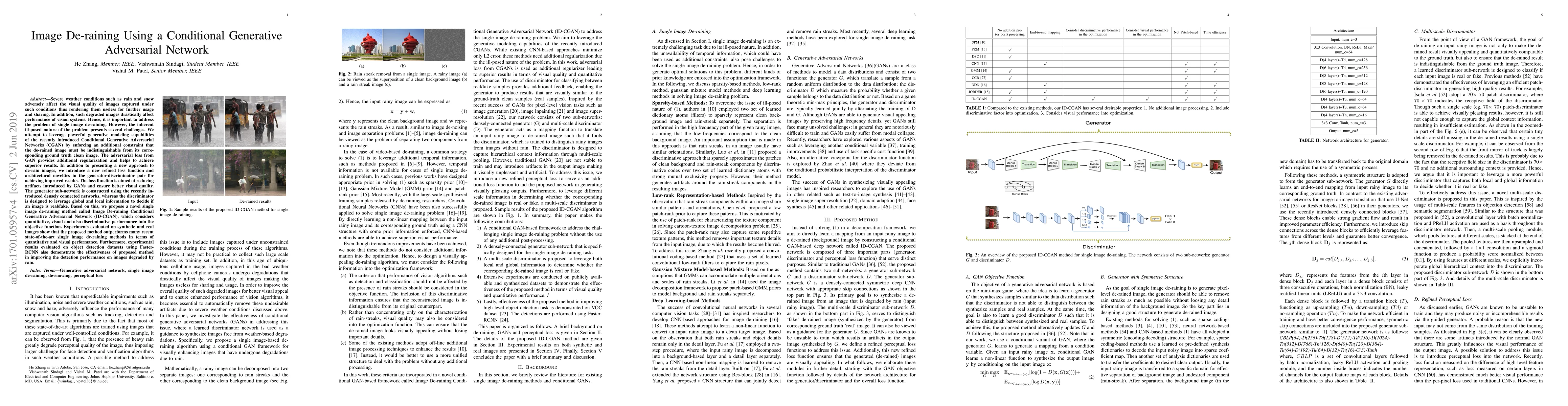 This paper proposes a novel single image de-raining method called Image De-raining Conditional Generative Adversarial Network (ID-CGAN) that uses conditional GANs to ensure de-rained images are indistinguishable from clear images for computer vision tasks. The method outperforms recent state-of-the-art techniques in both quantitative and visual performance.