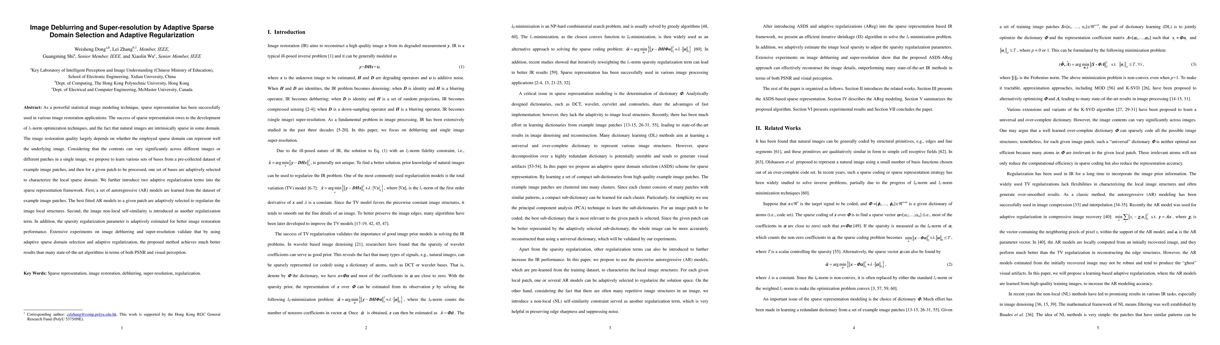 This paper proposes a method for image deblurring and super-resolution that uses adaptive sparse domain selection and regularization to improve restoration quality, achieving better results than state-of-the-art algorithms.