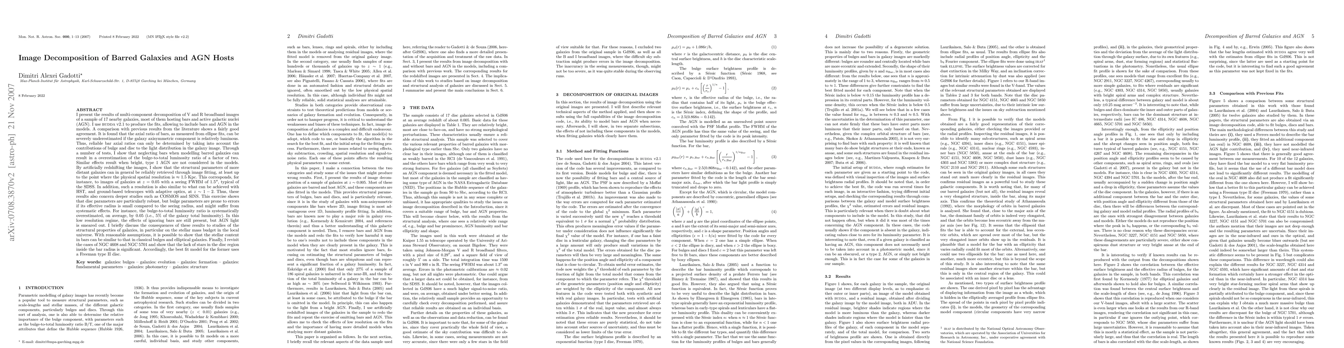I present the results of multi-component decomposition of V and R broadband images of a sample of 17 nearby galaxies, most of them hosting bars and active galactic nuclei. I use BUDDA v2.1 to produce the fits, allowing to include bars and AGN in the models. A comparison with previous results from the literature shows a fairly good agreement. It is found that the axial ratio of bars, as measured from ellipse fits, can be severely underestimated if the galaxy axisymmetric component is relatively luminous. Thus, reliable bar axial ratios can only be determined by taking into account the contributions of bulge and disc to the light distribution in the galaxy image. Through a number of tests, I show that neglecting bars when modelling barred galaxies can result in a overestimation of the bulge-to-total luminosity ratio of a factor of two. Similar effects result when bright, type 1 AGN are not considered in the models. By artificially redshifting the images, I show that the structural parameters of more distant galaxies can in general be reliably retrieved through image fitting, at least up to the point where the physical spatial resolution is ~ 1.5 Kpc. This exercise shows that disc parameters are particularly robust, but bulge parameters are prone to errors if its effective radius is small compared to the seeing radius, and might suffer from systematic effects. In this low resolution regime, the effects of ignoring bars are still present, but AGN light is smeared out. I briefly discuss the consequences of these results to studies of the structural properties of galaxies, in particular on the stellar mass budget in the local universe. With reasonable assumptions, it is possible to show that the stellar content in bars can be similar to that in classical bulges and elliptical galaxies. (Abridged)