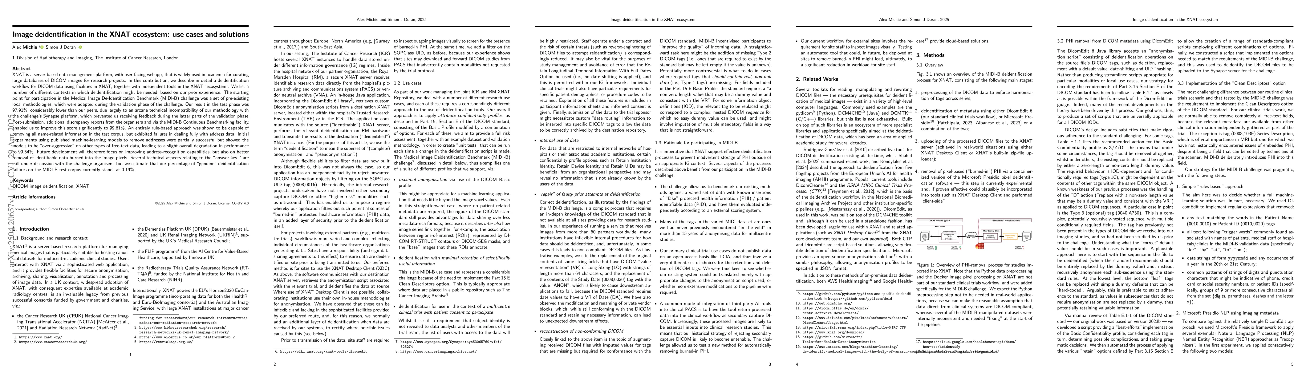 The research describes a deidentification workflow for DICOM data using XNAT facilities and independent tools within the XNAT ecosystem, adapted from pre-existing local methodologies for the MIDI-B challenge.