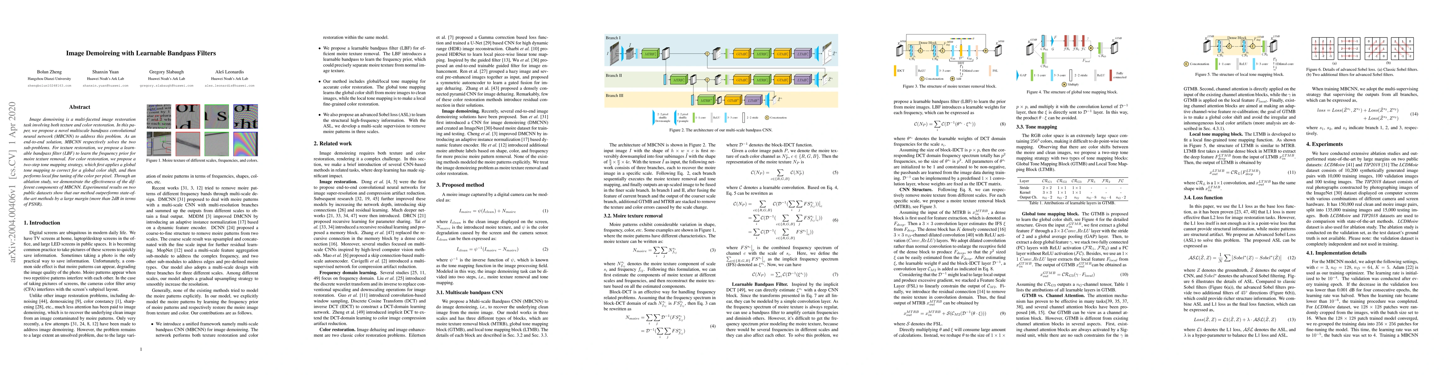 Image demoireing is a multi-faceted image restoration task involving both texture and color restoration. In this paper, we propose a novel multiscale bandpass convolutional neural network (MBCNN) to address this problem. As an end-to-end solution, MBCNN respectively solves the two sub-problems. For texture restoration, we propose a learnable bandpass filter (LBF) to learn the frequency prior for moire texture removal. For color restoration, we propose a two-step tone mapping strategy, which first applies a global tone mapping to correct for a global color shift, and then performs local fine tuning of the color per pixel. Through an ablation study, we demonstrate the effectiveness of the different components of MBCNN. Experimental results on two public datasets show that our method outperforms state-of-the-art methods by a large margin (more than 2dB in terms of PSNR).