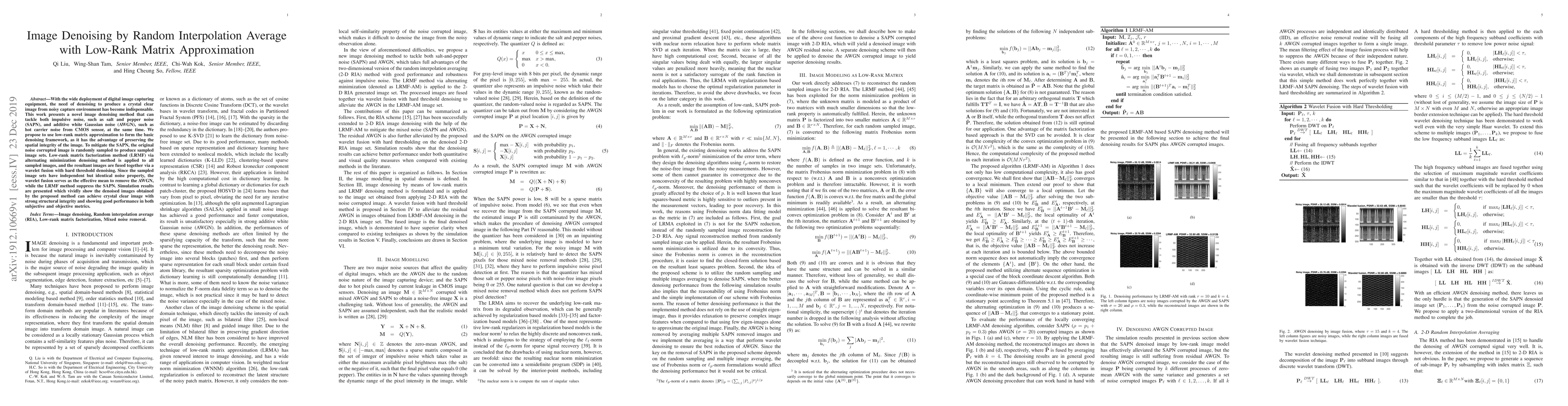 This paper presents a novel image denoising method using low-rank matrix approximation and random interpolation to effectively tackle both impulsive and additive Gaussian noise. The proposed method leverages wavelet fusion and alternating minimization to achieve crystal clear images with preserved spatial integrity.