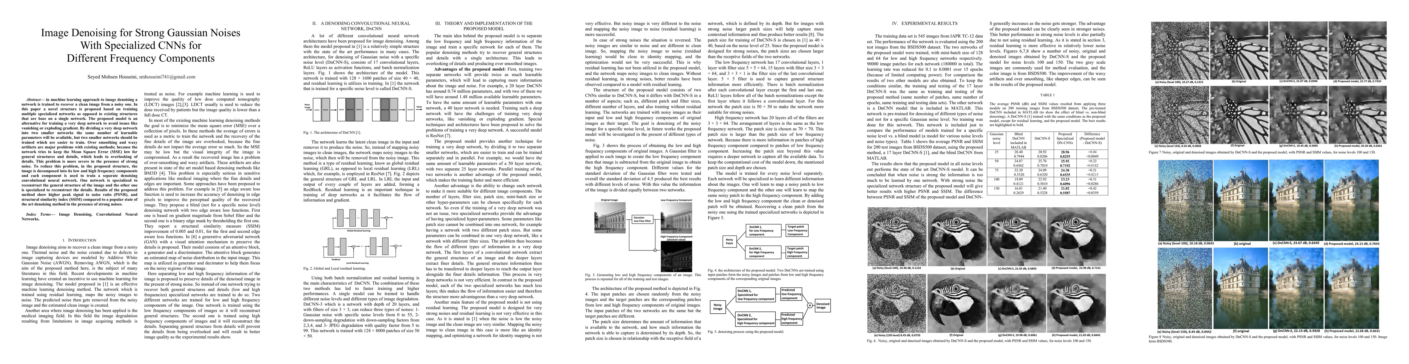 In machine learning approach to image denoising a network is trained to recover a clean image from a noisy one. In this paper a novel structure is proposed based on training multiple specialized networks as opposed to existing structures that are base on a single network. The proposed model is an alternative for training a very deep network to avoid issues like vanishing or exploding gradient. By dividing a very deep network into two smaller networks the same number of learnable parameters will be available, but two smaller networks should be trained which are easier to train. Over smoothing and waxy artifacts are major problems with existing methods; because the network tries to keep the Mean Square Error (MSE) low for general structures and details, which leads to overlooking of details. This problem is more severe in the presence of strong noise. To reduce this problem, in the proposed structure, the image is decomposed into its low and high frequency components and each component is used to train a separate denoising convolutional neural network. One network is specialized to reconstruct the general structure of the image and the other one is specialized to reconstruct the details. Results of the proposed method show higher peak signal to noise ratio (PSNR), and structural similarity index (SSIM) compared to a popular state of the art denoising method in the presence of strong noises.