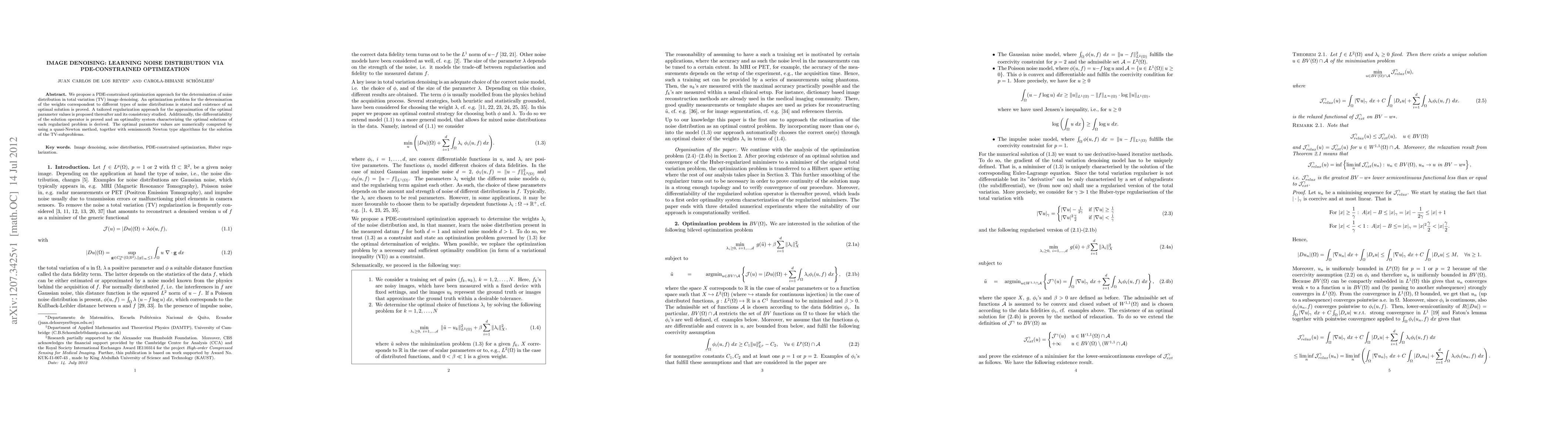 This paper introduces a PDE-constrained optimization technique for identifying noise distribution in total variation image denoising, proving the existence of an optimal solution and the differentiability of the solution operator. Numerical solutions are computed using quasi-Newton methods and semismooth Newton algorithms.