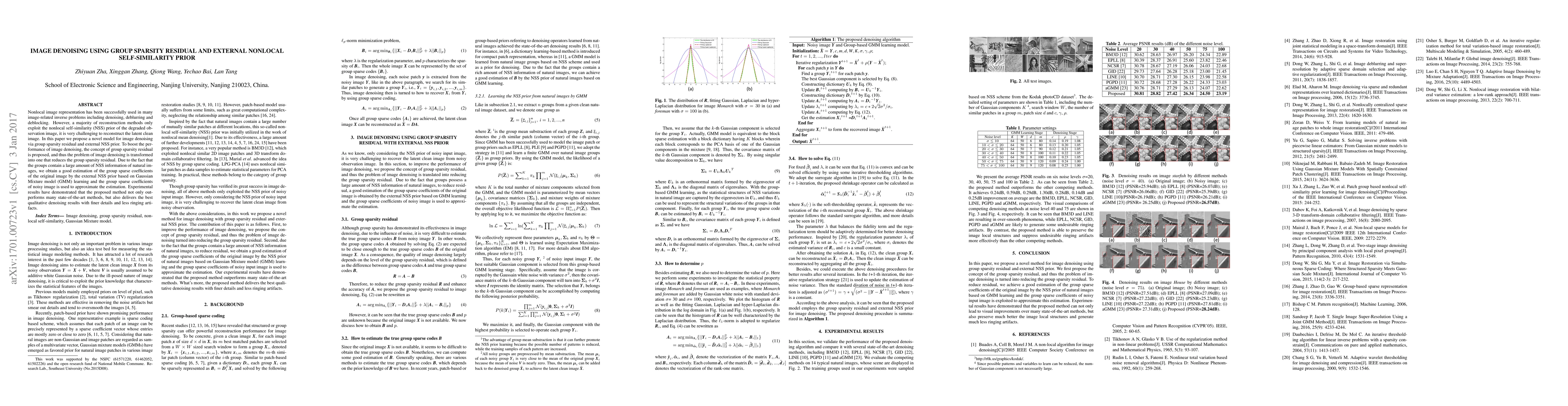 This paper proposes a novel image denoising model that leverages group sparsity residual and an external nonlocal self-similarity prior. The method transforms denoising into minimizing group sparsity residual, achieving better results with finer details and fewer artifacts compared to state-of-the-art techniques.