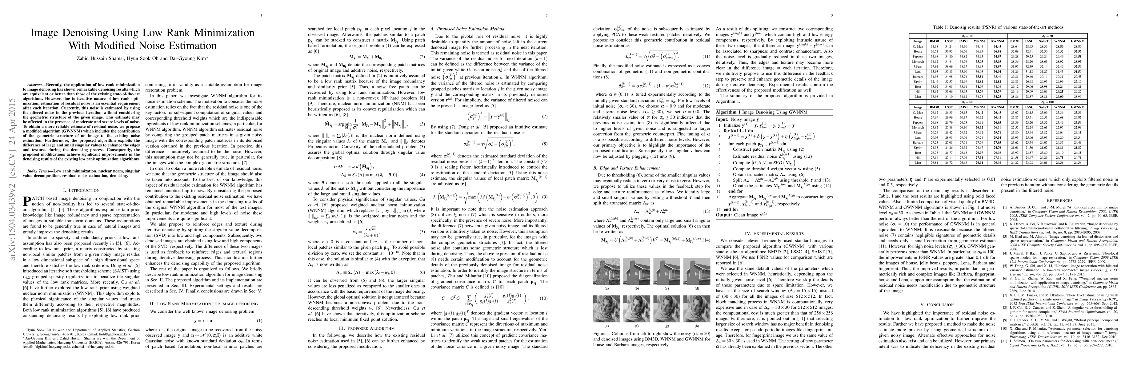 This paper proposes a modified low rank minimization algorithm (GWNNM) for image denoising that incorporates the geometric structure of the image to improve noise estimation, leading to better denoising results. The method also leverages the difference between large and small singular values to enhance edges and textures, achieving significant improvements over existing algorithms.