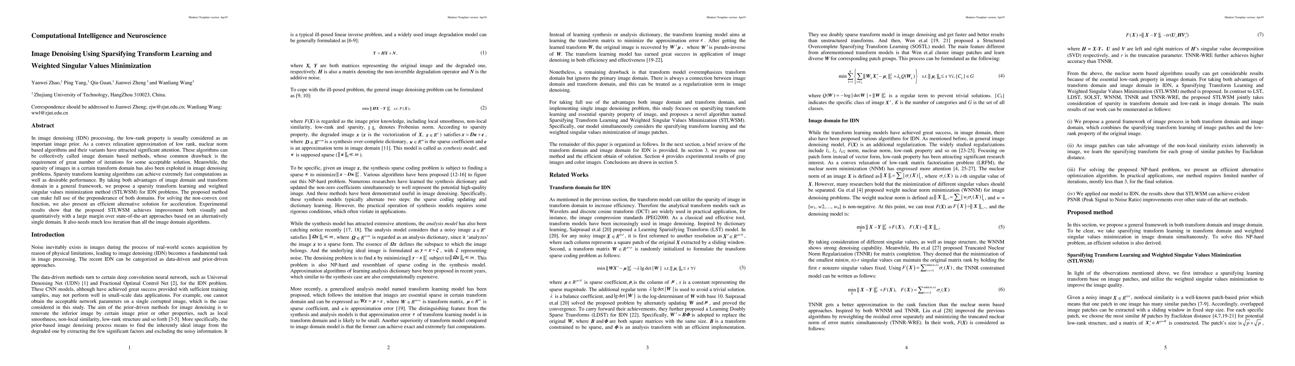 The paper proposes a novel method combining sparsifying transform learning and weighted singular values minimization for image denoising. This method leverages the advantages of both image domain and transform domain, achieving faster computation and better performance compared to existing methods.