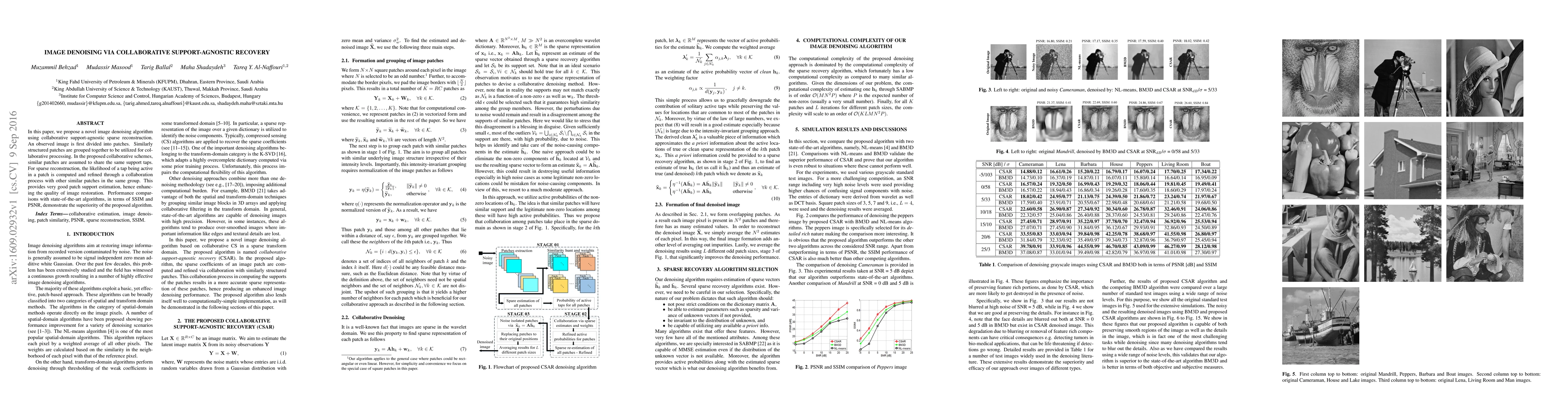 This paper introduces an innovative image denoising method based on collaborative support-agnostic sparse reconstruction, where patches of similar structure collaborate to refine the likelihood of active support taps, leading to superior image restoration quality compared to state-of-the-art algorithms.