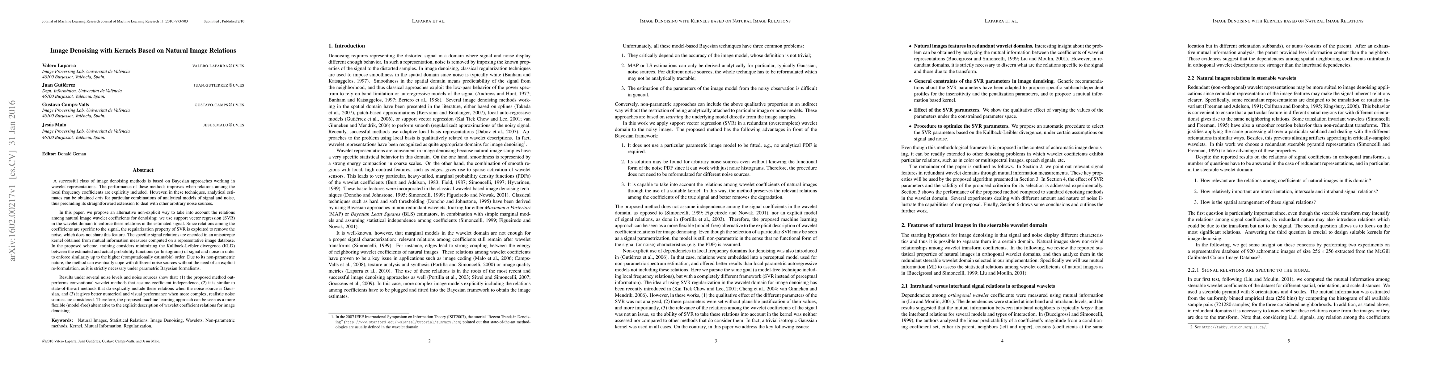 A successful class of image denoising methods is based on Bayesian approaches working in wavelet representations. However, analytical estimates can be obtained only for particular combinations of analytical models of signal and noise, thus precluding its straightforward extension to deal with other arbitrary noise sources. In this paper, we propose an alternative non-explicit way to take into account the relations among natural image wavelet coefficients for denoising: we use support vector regression (SVR) in the wavelet domain to enforce these relations in the estimated signal. Since relations among the coefficients are specific to the signal, the regularization property of SVR is exploited to remove the noise, which does not share this feature. The specific signal relations are encoded in an anisotropic kernel obtained from mutual information measures computed on a representative image database. Training considers minimizing the Kullback-Leibler divergence (KLD) between the estimated and actual probability functions of signal and noise in order to enforce similarity. Due to its non-parametric nature, the method can eventually cope with different noise sources without the need of an explicit re-formulation, as it is strictly necessary under parametric Bayesian formalisms. Results under several noise levels and noise sources show that: (1) the proposed method outperforms conventional wavelet methods that assume coefficient independence, (2) it is similar to state-of-the-art methods that do explicitly include these relations when the noise source is Gaussian, and (3) it gives better numerical and visual performance when more complex, realistic noise sources are considered. Therefore, the proposed machine learning approach can be seen as a more flexible (model-free) alternative to the explicit description of wavelet coefficient relations for image denoising.