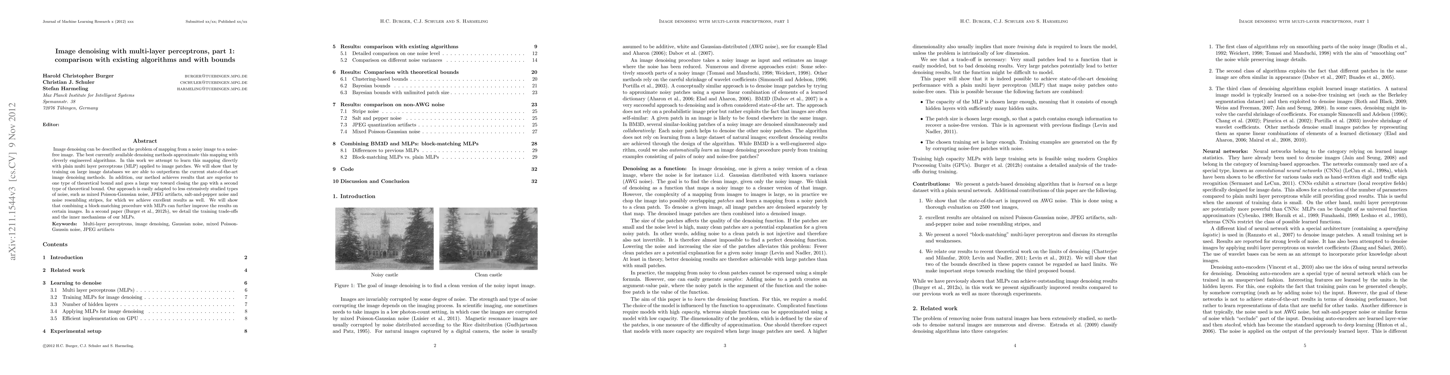 This paper explores using multi-layer perceptrons (MLP) for image denoising, demonstrating superior performance over existing algorithms and closing the gap with theoretical bounds. The method also shows effectiveness for various types of noise and can be enhanced with block-matching techniques.