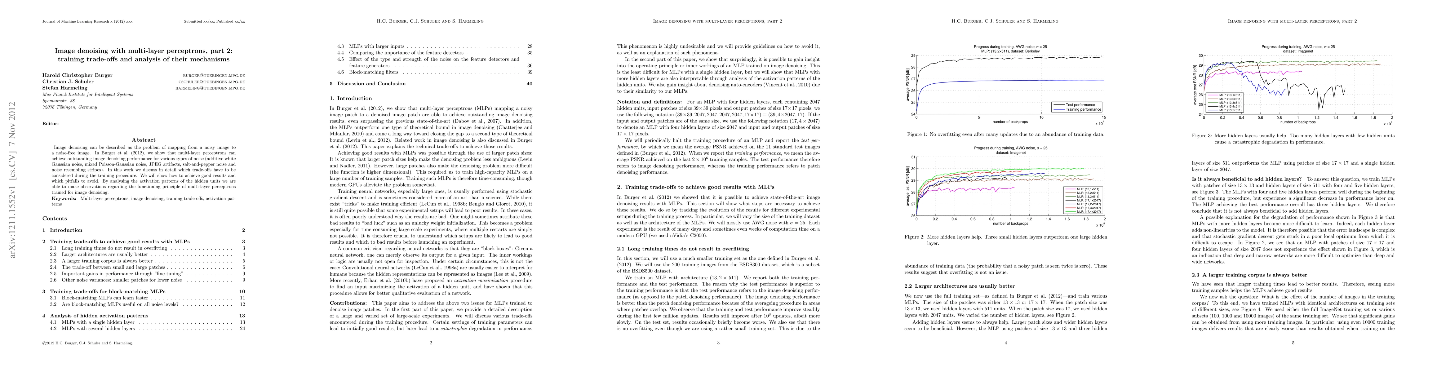 This paper explores the training trade-offs and mechanisms of multi-layer perceptrons for image denoising, emphasizing strategies to achieve optimal performance while avoiding common pitfalls. It analyzes hidden unit activation patterns to gain insights into the functioning of these neural networks for denoising various types of noise.