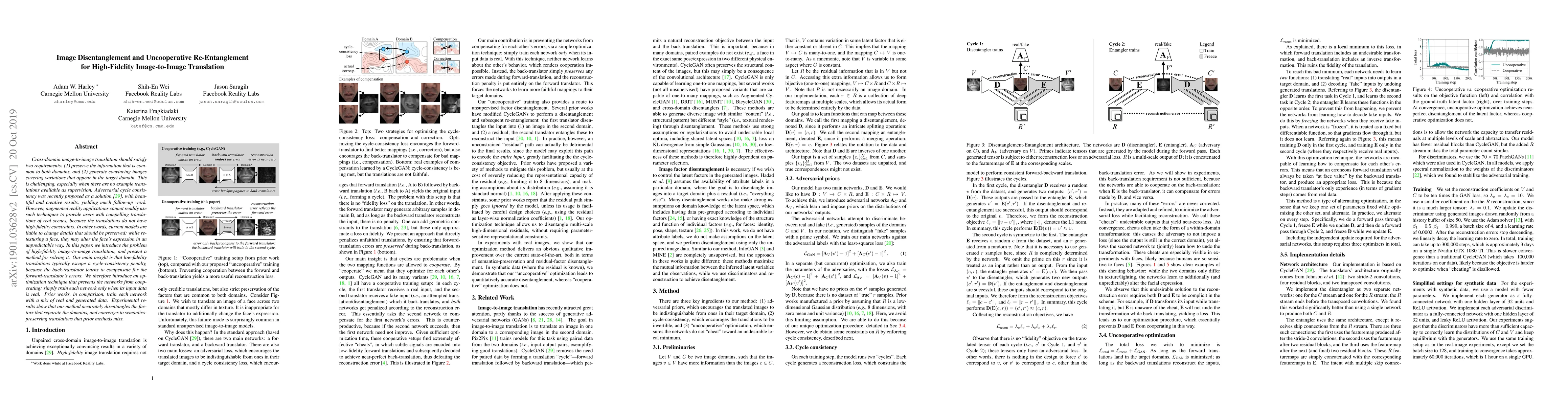 Cross-domain image-to-image translation should satisfy two requirements: (1) preserve the information that is common to both domains, and (2) generate convincing images covering variations that appear in the target domain. This is challenging, especially when there are no example translations available as supervision. Adversarial cycle consistency was recently proposed as a solution, with beautiful and creative results, yielding much follow-up work. However, augmented reality applications cannot readily use such techniques to provide users with compelling translations of real scenes, because the translations do not have high-fidelity constraints. In other words, current models are liable to change details that should be preserved: while re-texturing a face, they may alter the face's expression in an unpredictable way. In this paper, we introduce the problem of high-fidelity image-to-image translation, and present a method for solving it. Our main insight is that low-fidelity translations typically escape a cycle-consistency penalty, because the back-translator learns to compensate for the forward-translator's errors. We therefore introduce an optimization technique that prevents the networks from cooperating: simply train each network only when its input data is real. Prior works, in comparison, train each network with a mix of real and generated data. Experimental results show that our method accurately disentangles the factors that separate the domains, and converges to semantics-preserving translations that prior methods miss.