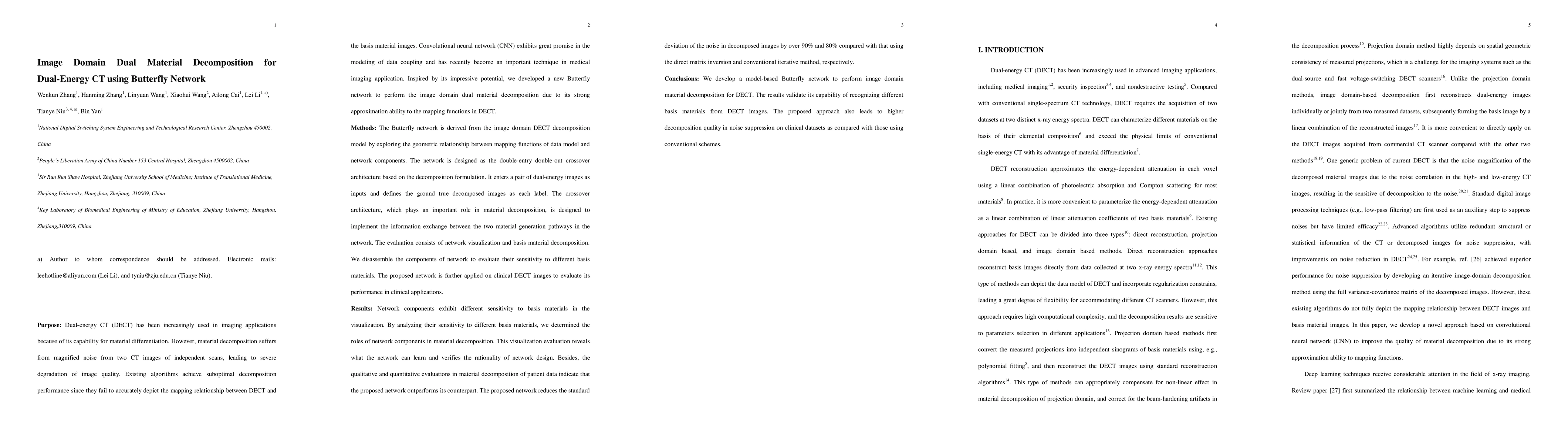 This paper introduces a Butterfly network for dual-energy CT (DECT) material decomposition, addressing noise issues from independent scans. The network's double-entry double-out crossover architecture enhances material decomposition performance by accurately mapping DECT to basis material images.