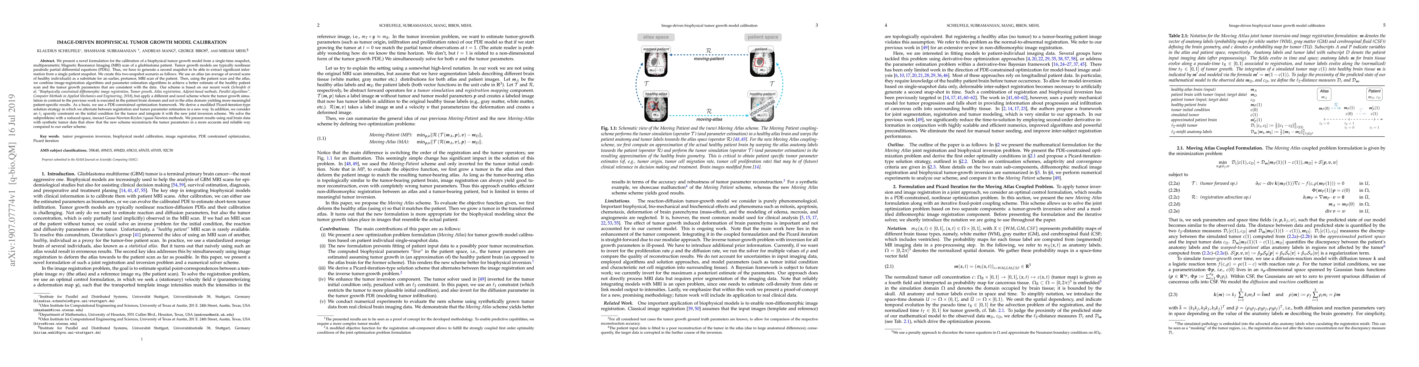 We present a novel formulation for the calibration of a biophysical tumor growth model from a single-time snapshot, MRI scan of a glioblastoma patient. Tumor growth models are typically nonlinear parabolic partial differential equations (PDEs). Thus, we have to generate a second snapshot to be able to extract significant information from a single patient snapshot. We create this two-snapshot scenario as follows. We use an atlas (an average of several scans of healthy individuals) as a substitute for an earlier, pretumor, MRI scan of the patient. Then, using the patient scan and the atlas, we combine image-registration algorithms and parameter estimation algorithms to achieve a better estimate of the healthy patient scan and the tumor growth parameters that are consistent with the data. Our scheme is based on our recent work (Scheufele et al, "Biophysically constrained diffeomorphic image registration, Tumor growth, Atlas registration, Adjoint-based methods, Parallel algorithms", CMAME, 2018), but apply a different and novel scheme where the tumor growth simulation in contrast to the previous work is executed in the patient brain domain and not in the atlas domain yielding more meaningful patient-specific results. As a basis, we use a PDE-constrained optimization framework. We derive a modified Picard-iteration-type solution strategy in which we alternate between registration and tumor parameter estimation in a new way. In addition, we consider an $\ell_1$ sparsity constraint on the initial condition for the tumor and integrate it with the new joint inversion scheme. We solve the subproblems with a reduced-space, inexact Gauss-Newton-Krylov/quasi-Newton methods. We present results using real brain data with synthetic tumor data that show that the new scheme reconstructs the tumor parameters in a more accurate and reliable way compared to our earlier scheme.