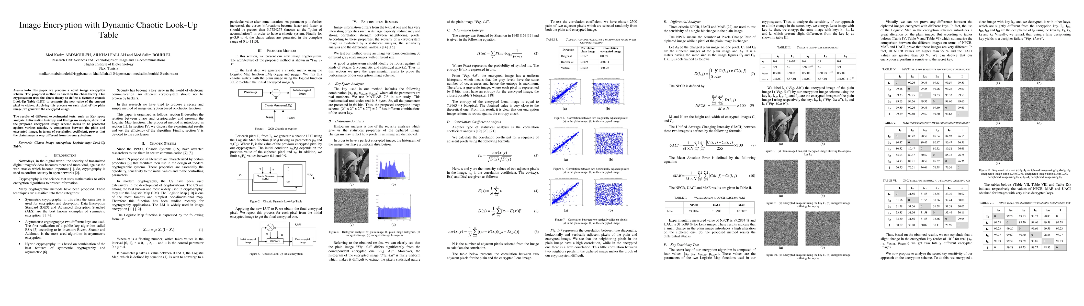 This paper introduces an image encryption method based on chaos theory, utilizing a dynamic chaotic Look-Up Table to transform each pixel, resulting in an encrypted image. Experimental tests indicate strong resistance against various attacks, with significant differences between plain and encrypted images.