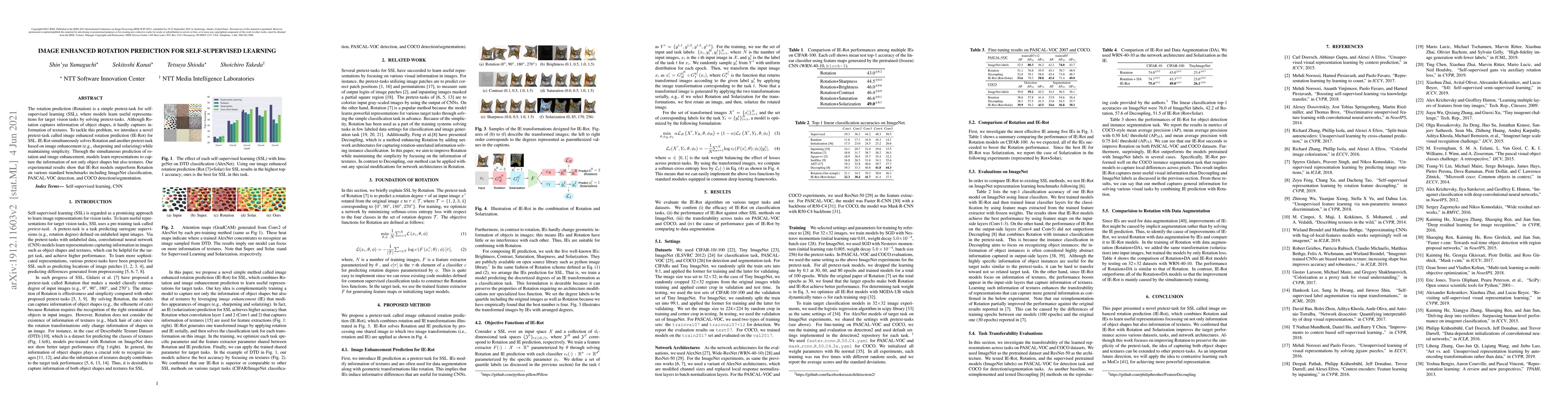 This paper introduces a novel self-supervised learning task called image enhanced rotation prediction (IE-Rot) that combines rotation prediction with image enhancement to capture both object shapes and textures. Experimental results show that IE-Rot outperforms traditional rotation prediction on various vision tasks.