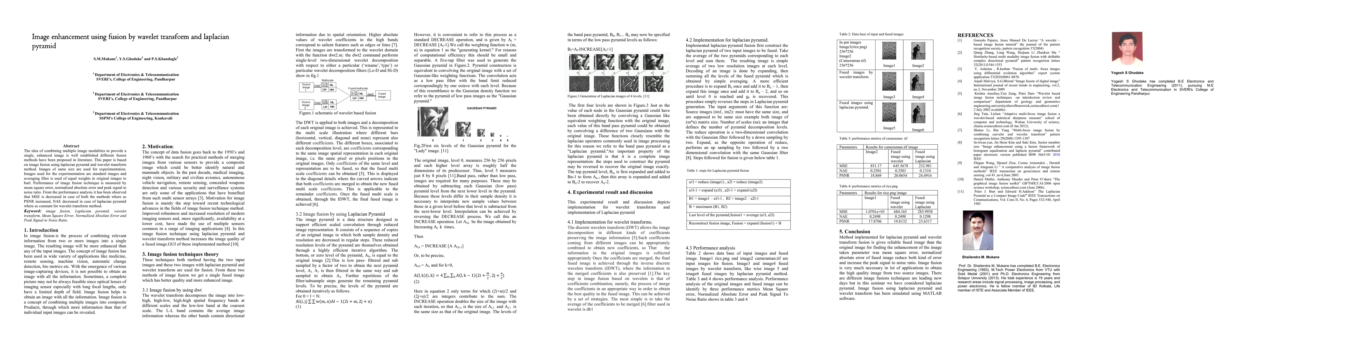 This paper explores image enhancement through fusion using a combination of laplacian pyramid and wavelet transform methods. Experimental results show improved performance in terms of decreased mean square error and increased peak signal-to-noise ratio, with specific improvements in normalized absolute error for the laplacian pyramid method.