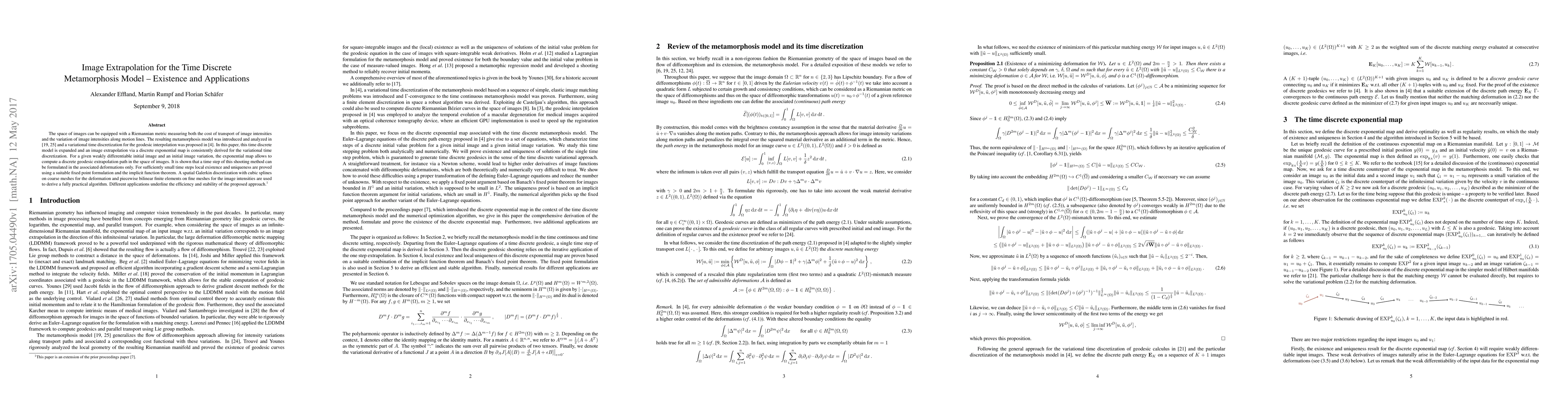 The space of images can be equipped with a Riemannian metric measuring both the cost of transport of image intensities and the variation of image intensities along motion lines. The resulting metamorphosis model was introduced and analyzed by Trouv\'e and Younes, and a variational time discretization for the geodesic interpolation was proposed by Berkels et al. In this paper, this time discrete model is expanded and an image extrapolation via a discrete exponential map is consistently derived for the variational time discretization. For a given weakly differentiable initial image and an initial image variation, the exponential map allows to compute a discrete geodesic extrapolation path in the space of images. It is shown that a time step of this shooting method can be formulated in the associated deformations only. For sufficiently small time steps local existence and uniqueness are proved using a suitable fixed point formulation and the implicit function theorem. A spatial Galerkin discretization with cubic splines on coarse meshes for the deformation and piecewise bilinear finite elements on fine meshes for the image intensities are used to derive a fully practical algorithm. Different applications underline the efficiency and stability of the proposed approach.