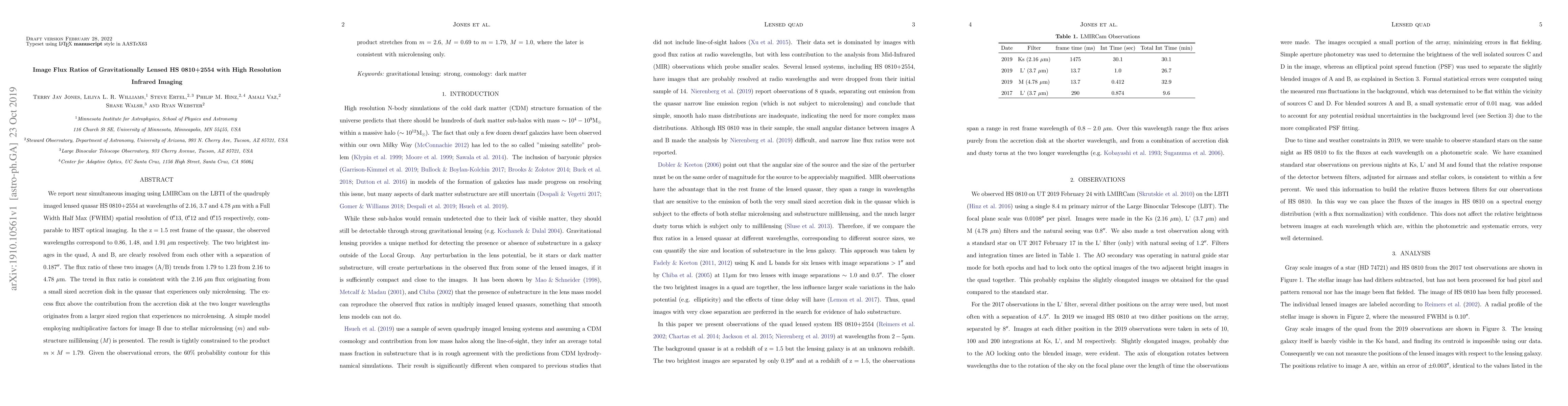 We report near simultaneous imaging using LMIRCam on the LBTI of the quadruply imaged lensed quasar HS 0810+2554 at wavelengths of 2.16, 3.7 and $4.78~\mu$m with a Full Width Half Max (FWHM) spatial resolution of $0^{\prime\prime}\!\!.13$, $0^{\prime\prime}\!\!.12$ and $0^{\prime\prime}\!\!.15$ respectively, comparable to HST optical imaging. In the $\rm{z} = 1.5$ rest frame of the quasar, the observed wavelengths correspond to 0.86, 1.48, and $1.91~\mu$m respectively. The two brightest images in the quad, A and B, are clearly resolved from each other with a separation of $0.187^{\prime\prime}$. The flux ratio of these two images (A/B) trends from 1.79 to 1.23 from 2.16 to $4.78~\mu$m. The trend in flux ratio is consistent with the $2.16~\mu$m flux originating from a small sized accretion disk in the quasar that experiences only microlensing. The excess flux above the contribution from the accretion disk at the two longer wavelengths originates from a larger sized region that experiences no microlensing. A simple model employing multiplicative factors for image B due to stellar microlensing $(m)$ and sub-structure millilensing $(M)$ is presented. The result is tightly constrained to the product $m\times M=1.79$. Given the observational errors, the 60\% probability contour for this product stretches from $m= 2.6$, $M = 0.69$ to $m= 1.79$, $M = 1.0$, where the later is consistent with microlensing only.