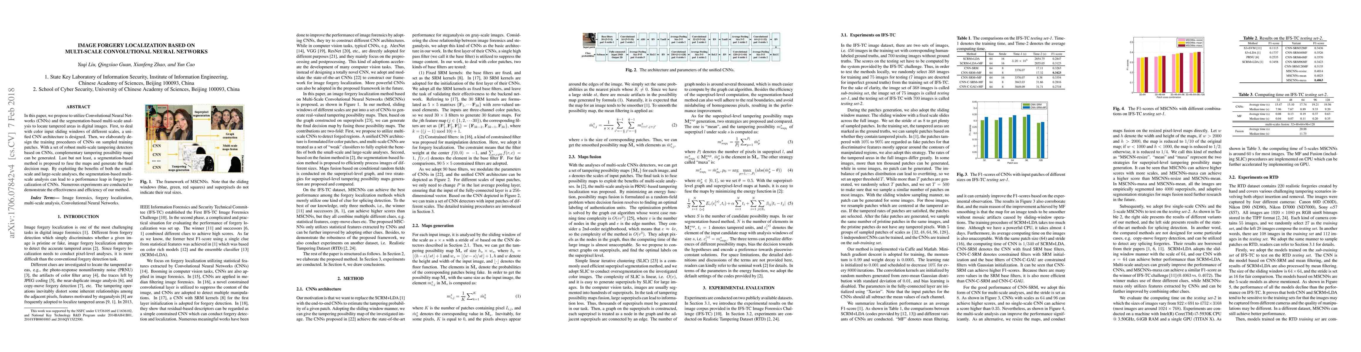 In this paper, we propose to utilize Convolutional Neural Networks (CNNs) and the segmentation-based multi-scale analysis to locate tampered areas in digital images. First, to deal with color input sliding windows of different scales, a unified CNN architecture is designed. Then, we elaborately design the training procedures of CNNs on sampled training patches. With a set of robust multi-scale tampering detectors based on CNNs, complementary tampering possibility maps can be generated. Last but not least, a segmentation-based method is proposed to fuse the maps and generate the final decision map. By exploiting the benefits of both the small-scale and large-scale analyses, the segmentation-based multi-scale analysis can lead to a performance leap in forgery localization of CNNs. Numerous experiments are conducted to demonstrate the effectiveness and efficiency of our method.