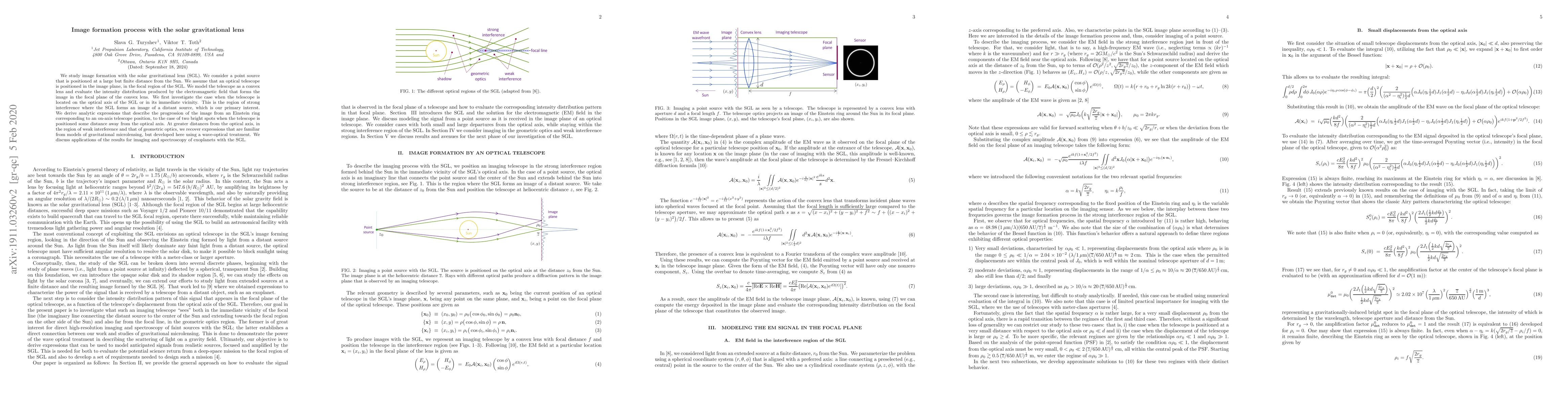 This paper investigates the image formation process using a solar gravitational lens (SGL) and a telescope positioned in the focal region, deriving analytic expressions for the image intensity distribution. It explores the transition from Einstein ring to two bright spots and discusses applications for exoplanet imaging and spectroscopy.