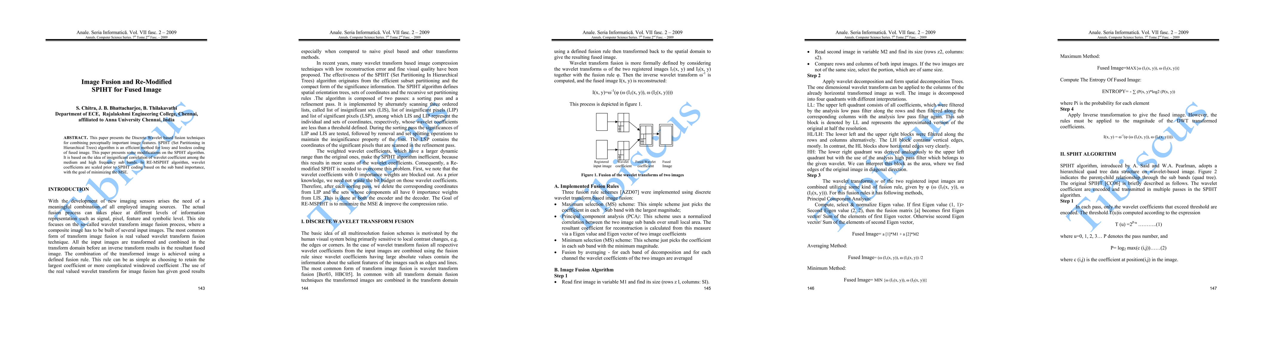 This paper introduces Discrete Wavelet based fusion techniques to combine important image features, utilizing a modified SPIHT algorithm called RE-MSPIHT. The RE-MSPIHT algorithm scales wavelet coefficients based on sub-band importance to minimize Mean Squared Error (MSE) for efficient fused image coding.