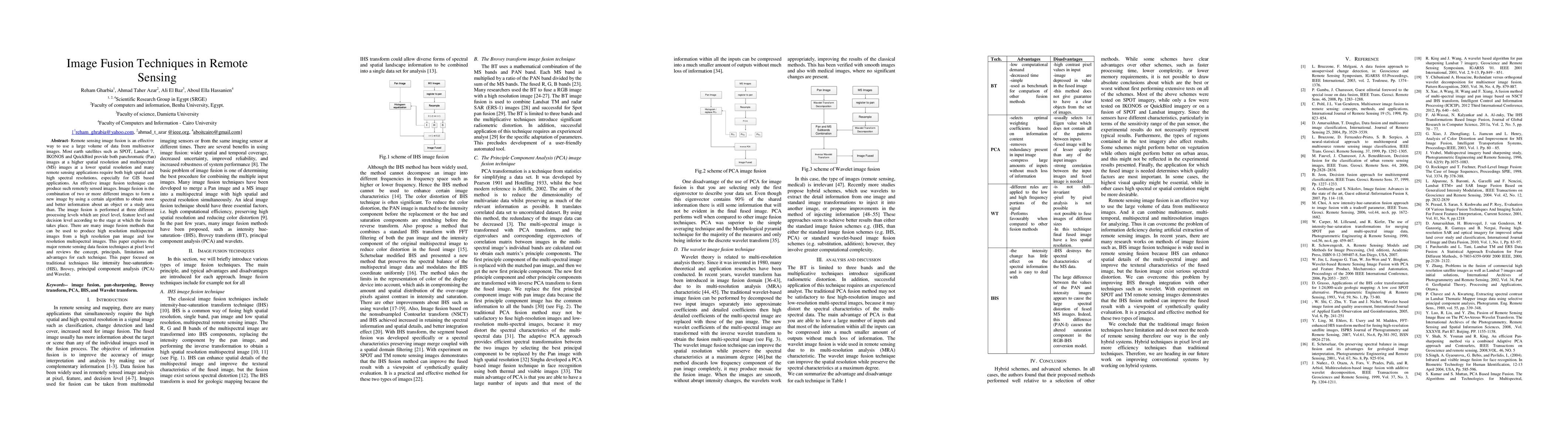This paper reviews remote sensing image fusion techniques, focusing on traditional methods like HIS, Brovey, PCA, and Wavelet to combine high-resolution panchromatic images with low-resolution multispectral images, aiming to enhance spatial and spectral resolutions for GIS applications. It examines the principles, advantages, and limitations of these pixel-level fusion techniques.