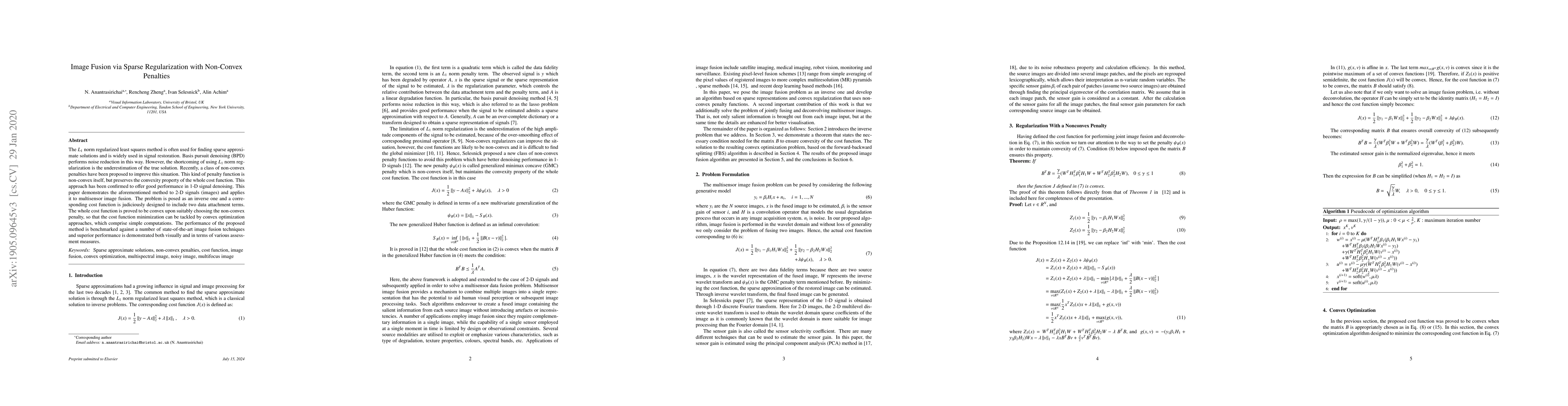 This paper proposes a method for image fusion using sparse regularization with non-convex penalties, demonstrating improved performance over L1 norm-based approaches. The method leverages non-convex penalties to enhance solution accuracy and employs convex optimization for efficient computation.