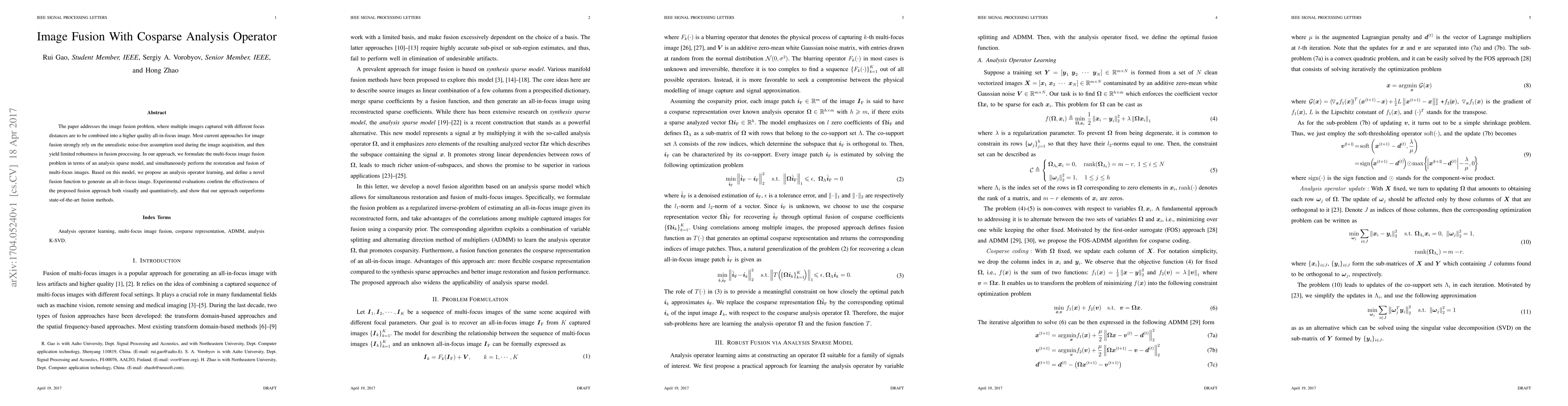 This paper proposes a novel method for image fusion using a cosparse analysis operator to combine multiple images with different focus distances into a single high-quality all-in-focus image, addressing the limitations of existing noise-free assumptions and demonstrating superior performance over state-of-the-art methods.