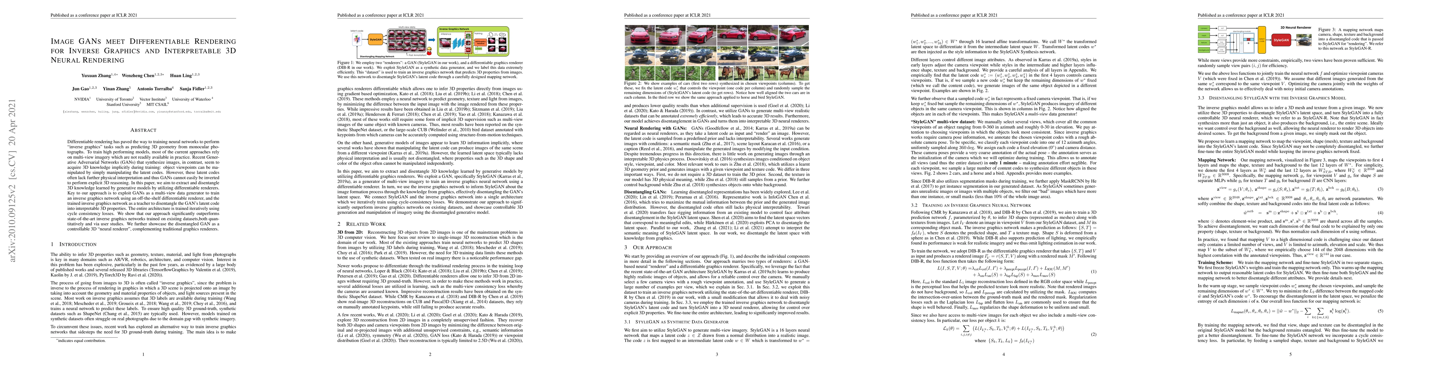 This paper combines Generative Adversarial Networks (GANs) with differentiable rendering to train an inverse graphics network that predicts 3D geometry from monocular images. It leverages GANs to generate multi-view data, which is then used to train the network, ultimately disentangling GAN latent codes into interpretable 3D properties, achieving superior performance over existing methods.