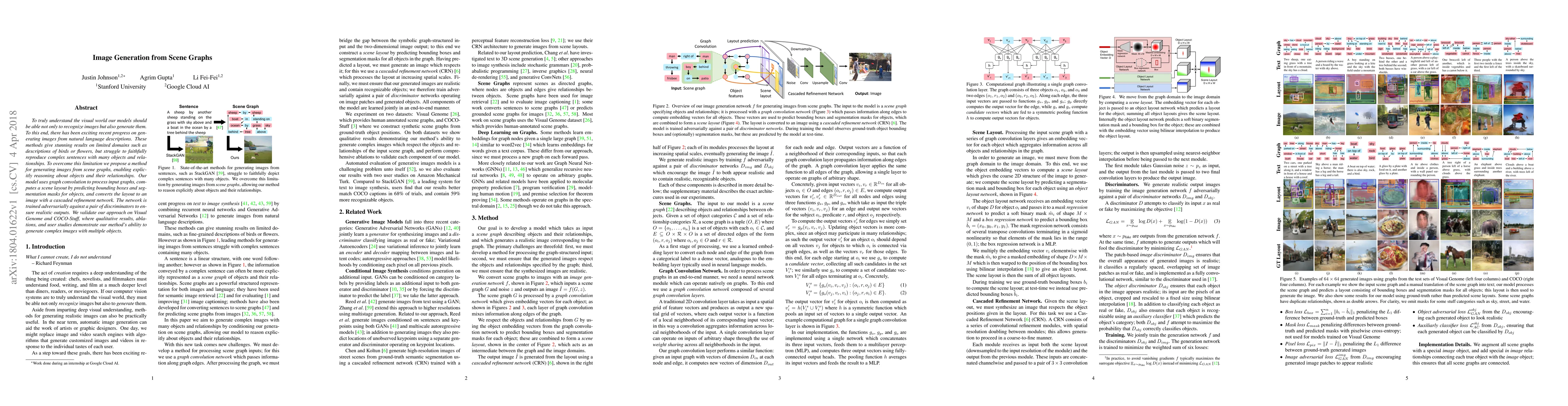 This paper proposes a method for generating images from scene graphs that explicitly reason about objects and their relationships. The model uses graph convolution and adversarial training to produce realistic images, validated on Visual Genome and COCO-Stuff datasets, demonstrating the capability to generate complex scenes with multiple objects.