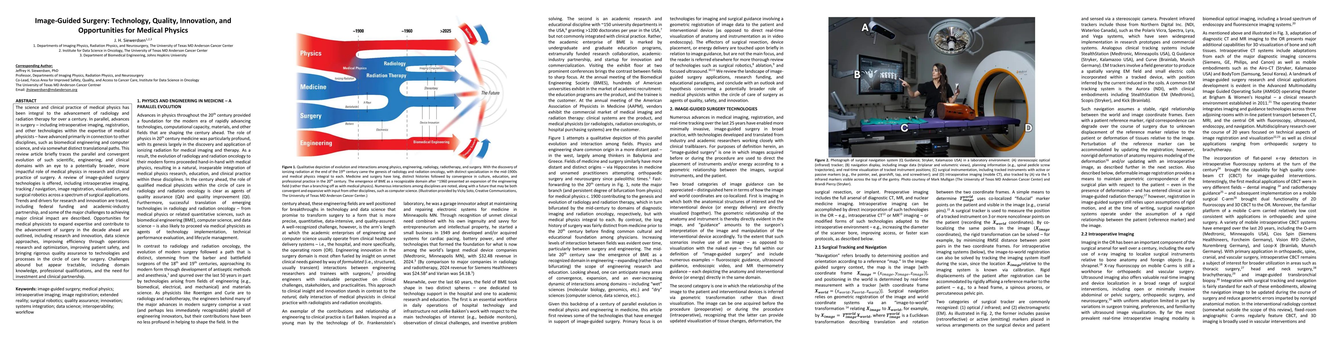 The science and clinical practice of medical physics has been integral to the advancement of radiology and radiation therapy for over a century. In parallel, advances in surgery - including intraoperative imaging, registration, and other technologies within the expertise of medical physicists - have advanced primarily in connection to other disciplines, such as biomedical engineering and computer science, and via somewhat distinct translational paths. This review article briefly traces the parallel and convergent evolution of such scientific, engineering, and clinical domains with an eye to a potentially broader, more impactful role of medical physics in research and clinical practice of surgery. A review of image-guided surgery technologies is offered, including intraoperative imaging, tracking / navigation, image registration, visualization, and surgical robotics across a spectrum of surgical applications. Trends and drivers for research and innovation are traced, including federal funding and academic-industry partnership, and some of the major challenges to achieving major clinical impact are described. Opportunities for medical physicists to expand expertise and contribute to the advancement of surgery in the decade ahead are outlined, including research and innovation, data science approaches, improving efficiency through operations research and optimization, improving patient safety, and bringing rigorous quality assurance to technologies and processes in the circle of care for surgery. Challenges abound but appear tractable, including domain knowledge, professional qualifications, and the need for investment and clinical partnership.