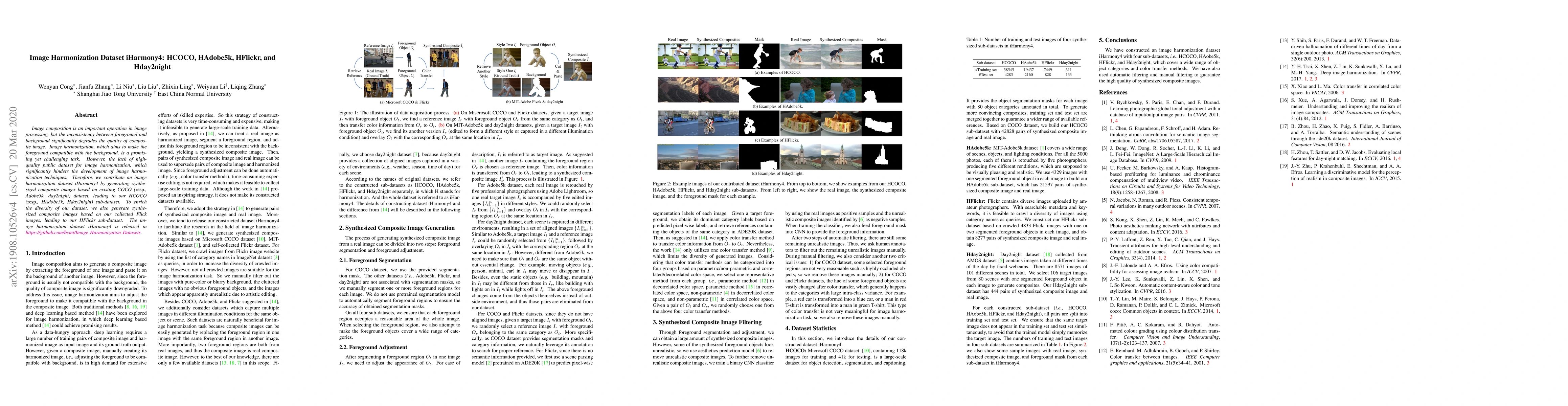 A new image harmonization dataset (iHarmony4) is introduced to support the development of techniques for making foreground images compatible with backgrounds, addressing a significant challenge in image processing.