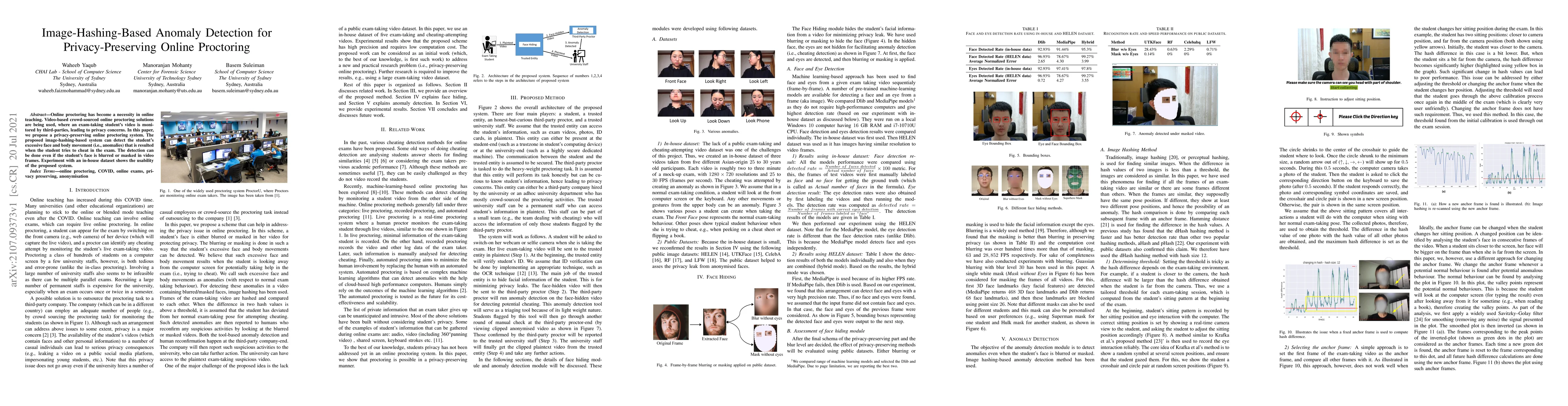 This paper proposes a privacy-preserving online proctoring system using image hashing to detect student anomalies like excessive movement, even when faces are blurred or masked. Experiments on an in-house dataset demonstrate the system's effectiveness.