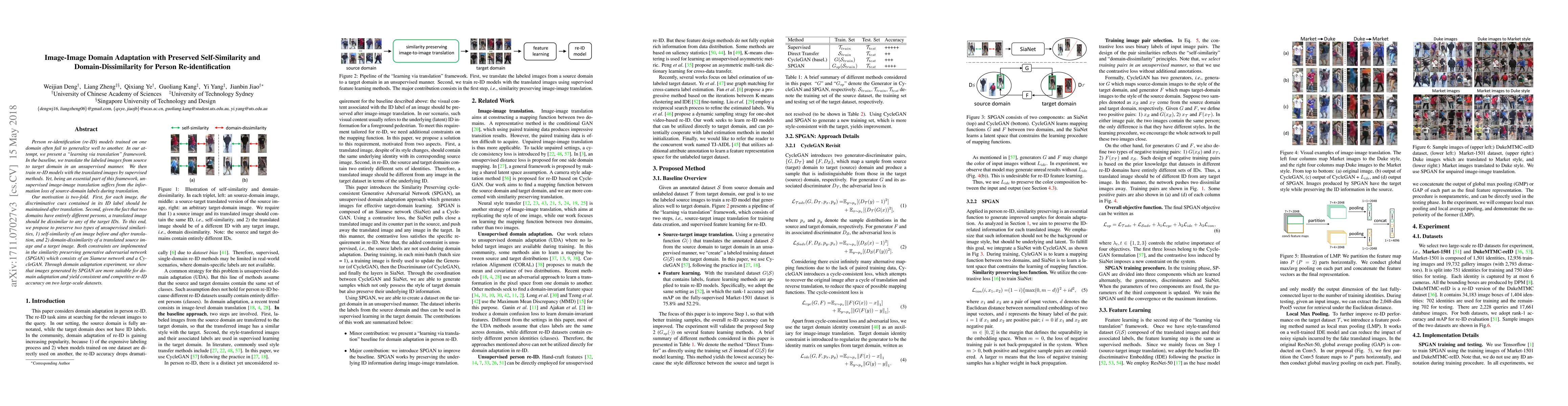 This paper proposes a "learning via translation" framework for domain adaptation in person re-identification, aiming to maintain self-similarity and domain-dissimilarity during image translation. The SPGAN model, combining a Siamese network and CycleGAN, effectively preserves these similarities, leading to better domain adaptation and competitive re-ID accuracy across datasets.