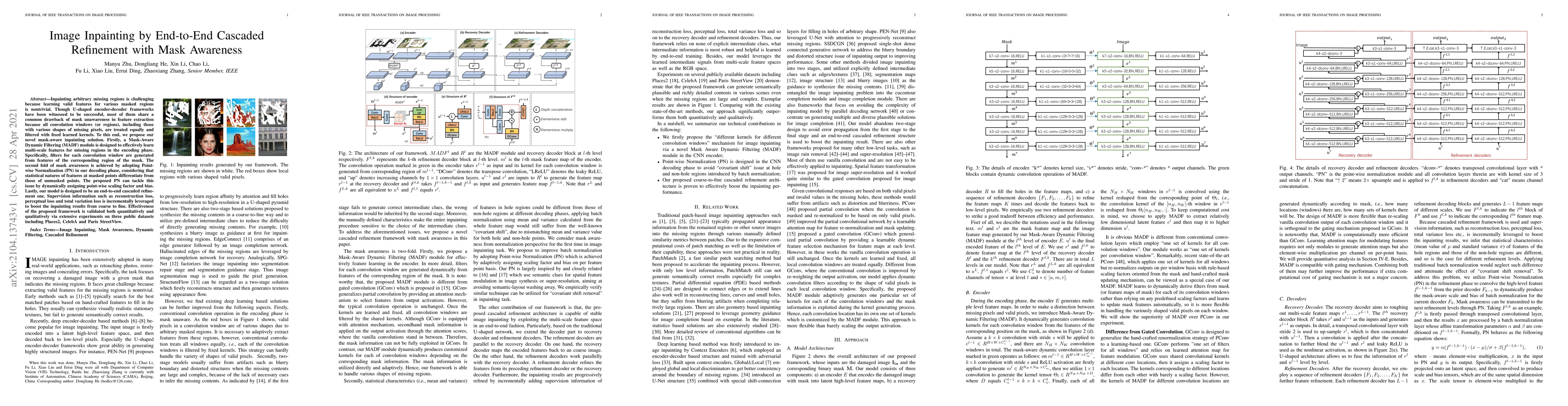 Inpainting arbitrary missing regions is challenging because learning valid features for various masked regions is nontrivial. Though U-shaped encoder-decoder frameworks have been witnessed to be successful, most of them share a common drawback of mask unawareness in feature extraction because all convolution windows (or regions), including those with various shapes of missing pixels, are treated equally and filtered with fixed learned kernels. To this end, we propose our novel mask-aware inpainting solution. Firstly, a Mask-Aware Dynamic Filtering (MADF) module is designed to effectively learn multi-scale features for missing regions in the encoding phase. Specifically, filters for each convolution window are generated from features of the corresponding region of the mask. The second fold of mask awareness is achieved by adopting Point-wise Normalization (PN) in our decoding phase, considering that statistical natures of features at masked points differentiate from those of unmasked points. The proposed PN can tackle this issue by dynamically assigning point-wise scaling factor and bias. Lastly, our model is designed to be an end-to-end cascaded refinement one. Supervision information such as reconstruction loss, perceptual loss and total variation loss is incrementally leveraged to boost the inpainting results from coarse to fine. Effectiveness of the proposed framework is validated both quantitatively and qualitatively via extensive experiments on three public datasets including Places2, CelebA and Paris StreetView.