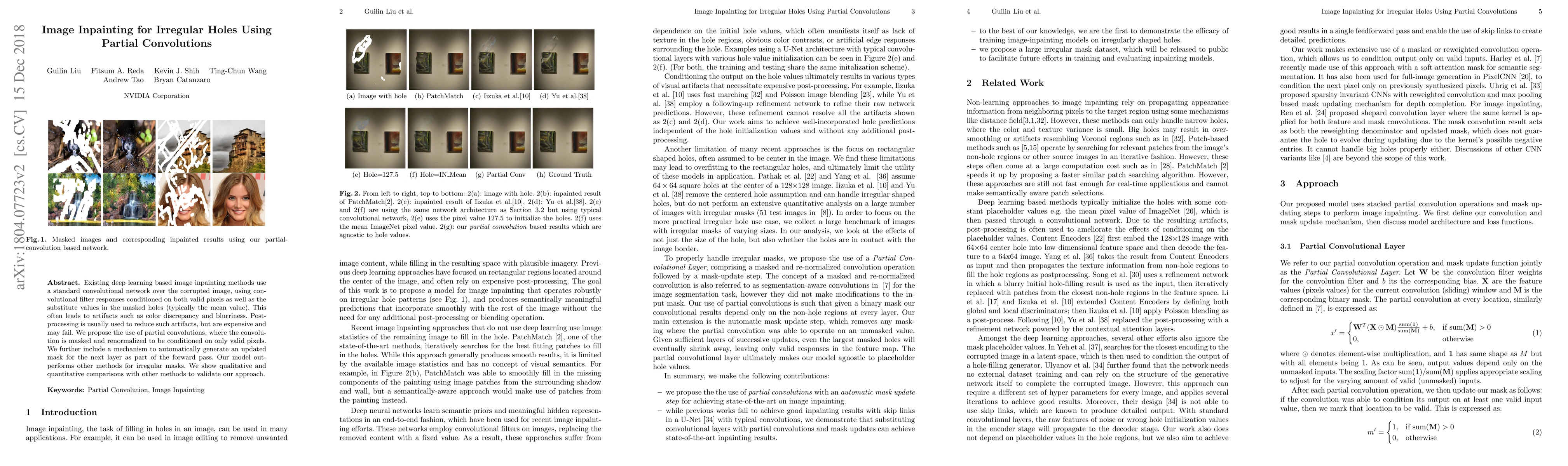 Existing deep learning based image inpainting methods use a standard convolutional network over the corrupted image, using convolutional filter responses conditioned on both valid pixels as well as the substitute values in the masked holes (typically the mean value). This often leads to artifacts such as color discrepancy and blurriness. Post-processing is usually used to reduce such artifacts, but are expensive and may fail. We propose the use of partial convolutions, where the convolution is masked and renormalized to be conditioned on only valid pixels. We further include a mechanism to automatically generate an updated mask for the next layer as part of the forward pass. Our model outperforms other methods for irregular masks. We show qualitative and quantitative comparisons with other methods to validate our approach.