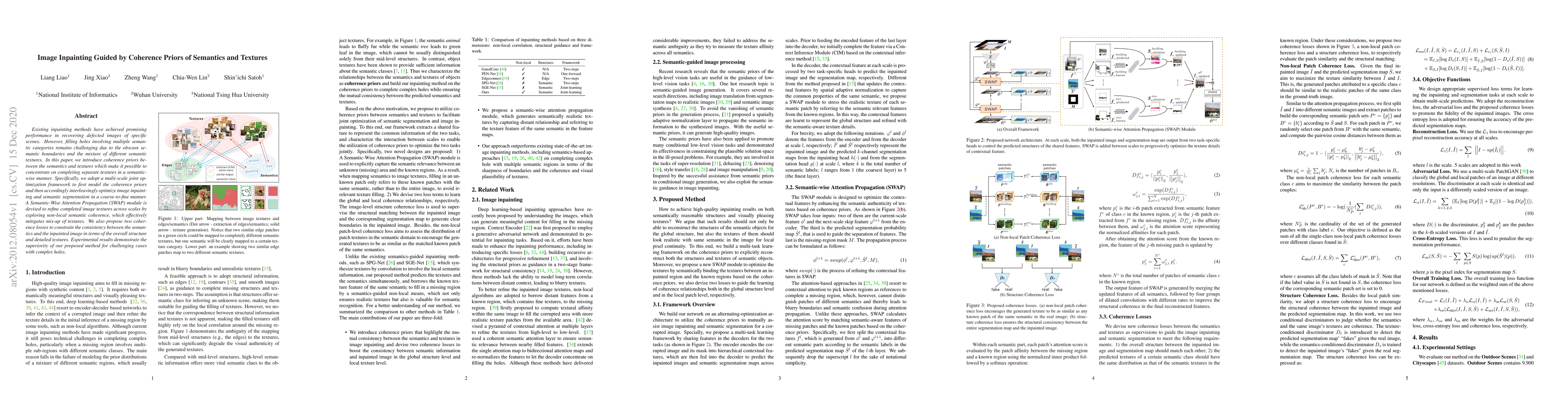 This paper proposes a method for image inpainting that leverages coherence priors between semantics and textures to handle complex holes involving multiple semantic categories. It employs a multi-scale joint optimization framework and a Semantic-Wise Attention Propagation module to refine textures and mitigate texture mix-up, achieving superior performance on challenging inpainting tasks.