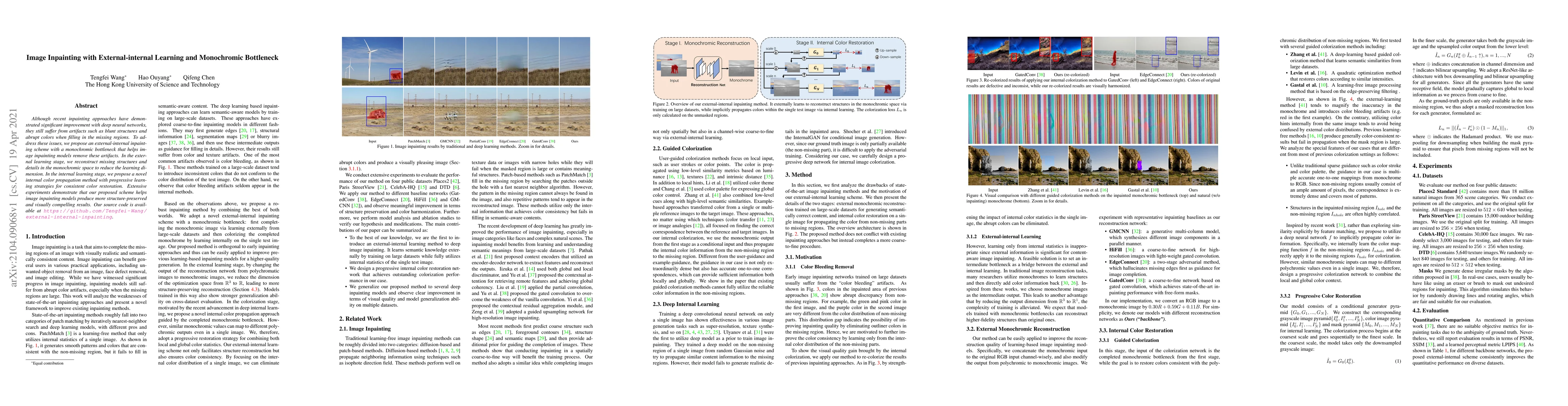 This paper proposes an image inpainting method using an external-internal learning scheme with a monochromic bottleneck to reduce artifacts. The external stage reconstructs missing details in monochromic space, while the internal stage employs a progressive color propagation method for better color consistency, resulting in more natural and artifact-free inpainted images.