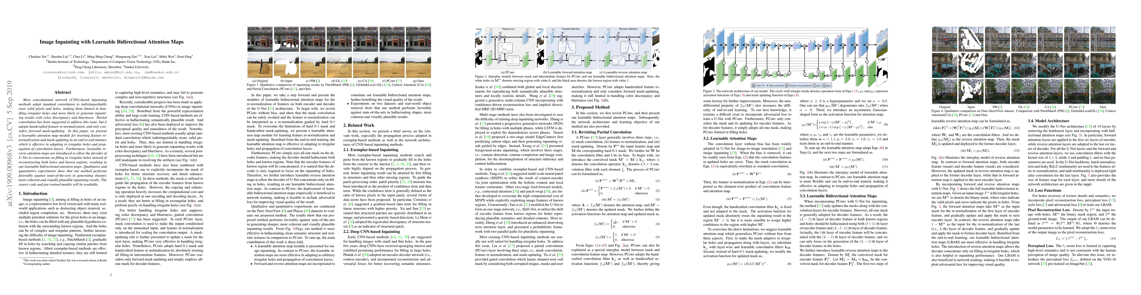This paper proposes a learnable bidirectional attention map module for image inpainting, which uses end-to-end training to adapt to irregular holes and improve feature renormalization. The method outperforms existing techniques by generating sharper and more coherent inpainting results, as demonstrated through qualitative and quantitative evaluations.