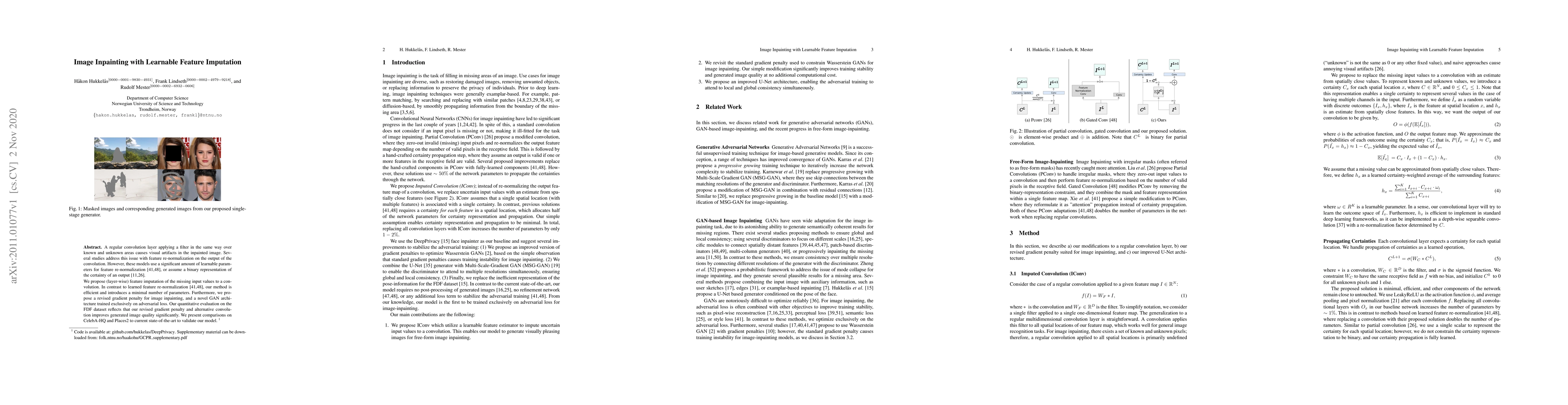 This paper proposes an efficient method for image inpainting using learnable feature imputation instead of feature re-normalization, reducing the number of parameters and improving image quality. The authors also introduce a revised gradient penalty and a novel GAN architecture, demonstrating superior performance compared to state-of-the-art methods on multiple datasets.