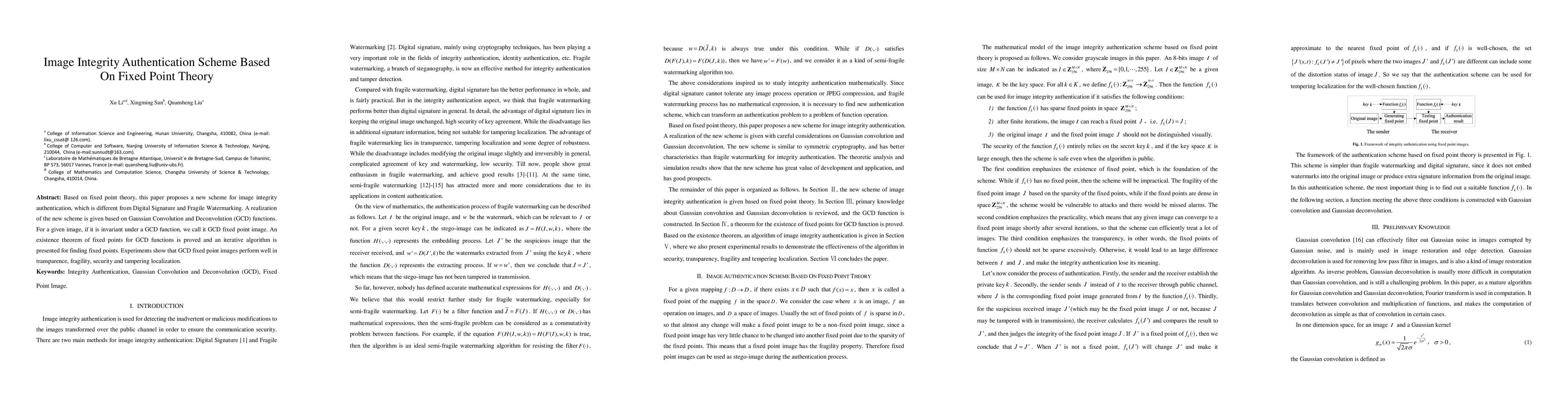 This paper introduces a novel image integrity authentication scheme based on fixed point theory, utilizing Gaussian Convolution and Deconvolution functions. The proposed method identifies GCD fixed point images, proving their existence and presenting an iterative algorithm for their detection, demonstrating strong performance in transparency, fragility, security, and tampering localization.