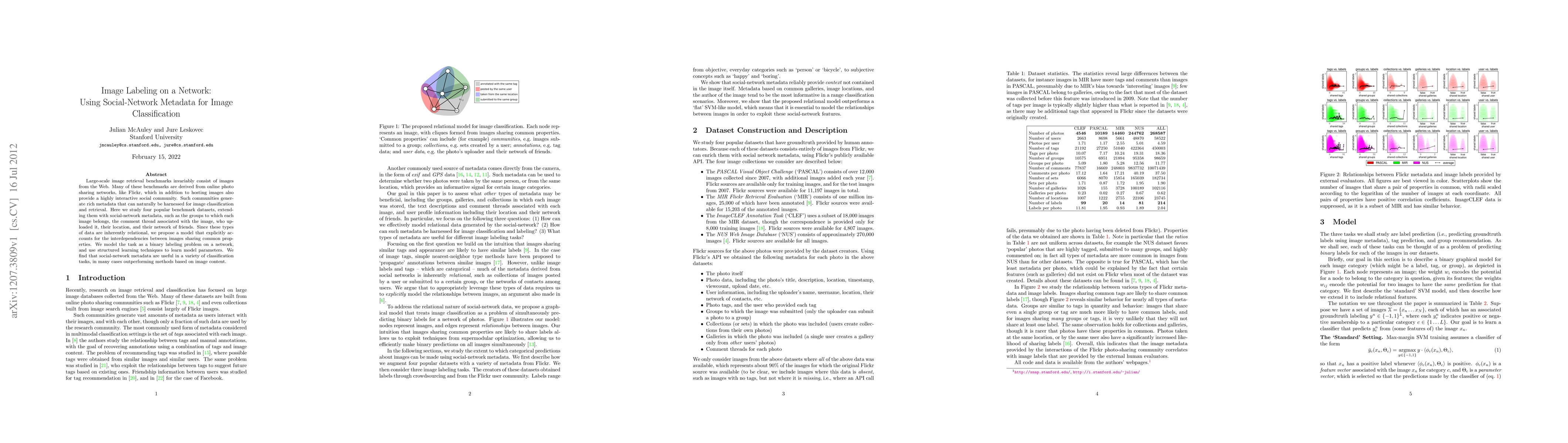 This paper explores leveraging social-network metadata for image classification on large-scale image retrieval datasets derived from online photo sharing networks. The authors propose a model that uses structured learning techniques to account for interdependencies between images, finding that social metadata often outperforms methods relying solely on image content.