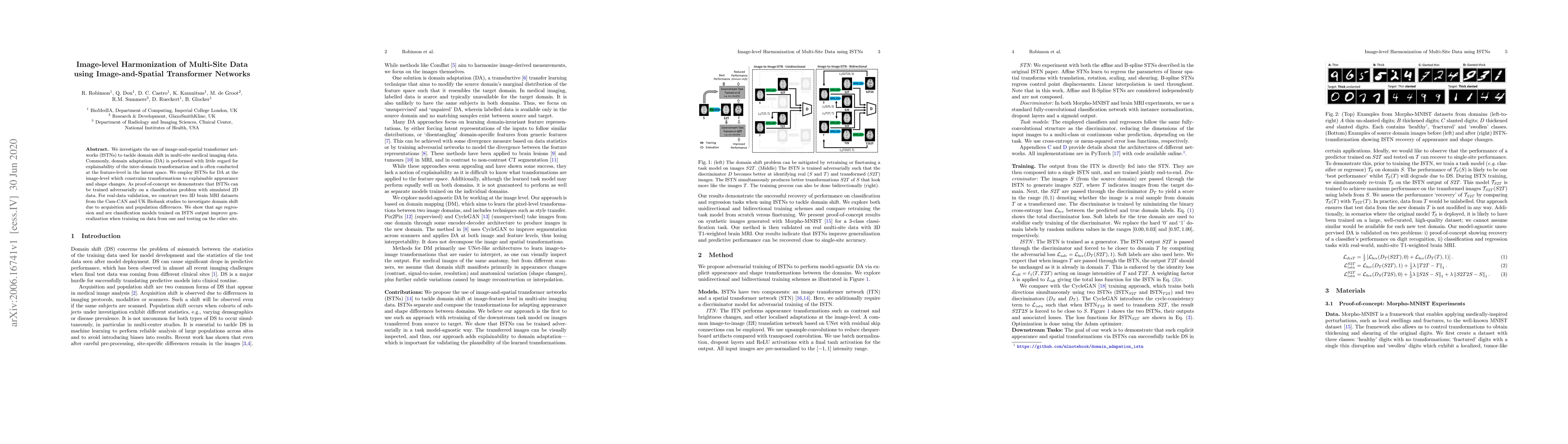 We investigate the use of image-and-spatial transformer networks (ISTNs) to tackle domain shift in multi-site medical imaging data. Commonly, domain adaptation (DA) is performed with little regard for explainability of the inter-domain transformation and is often conducted at the feature-level in the latent space. We employ ISTNs for DA at the image-level which constrains transformations to explainable appearance and shape changes. As proof-of-concept we demonstrate that ISTNs can be trained adversarially on a classification problem with simulated 2D data. For real-data validation, we construct two 3D brain MRI datasets from the Cam-CAN and UK Biobank studies to investigate domain shift due to acquisition and population differences. We show that age regression and sex classification models trained on ISTN output improve generalization when training on data from one and testing on the other site.