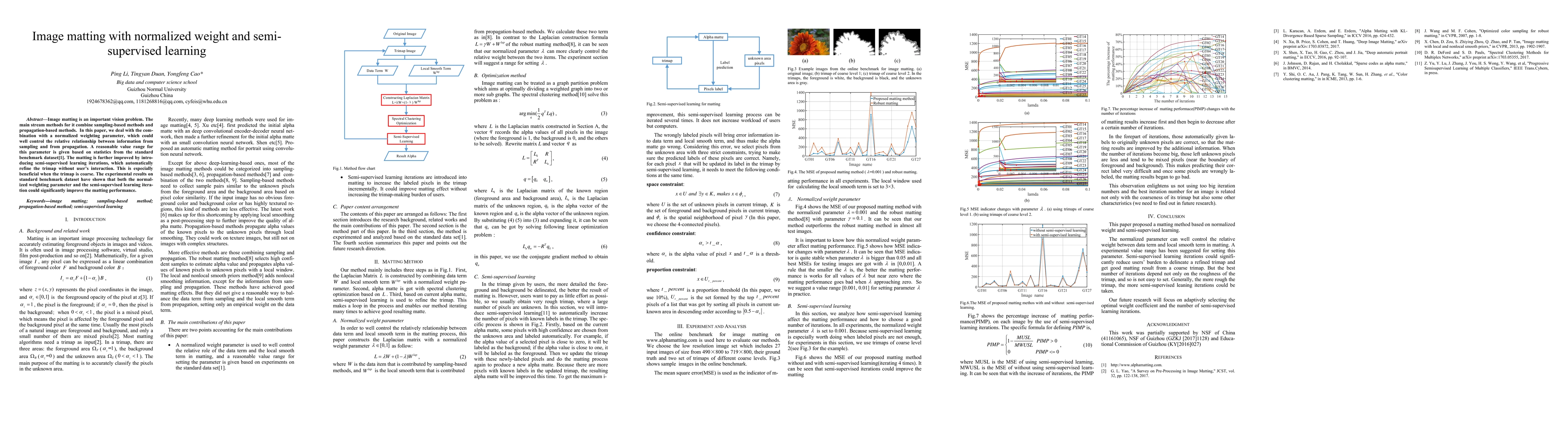 This research paper improves image matting performance by introducing a normalized weighting parameter to balance sampling and propagation methods, and semi-supervised learning iterations for automatic refinement of the trimap.