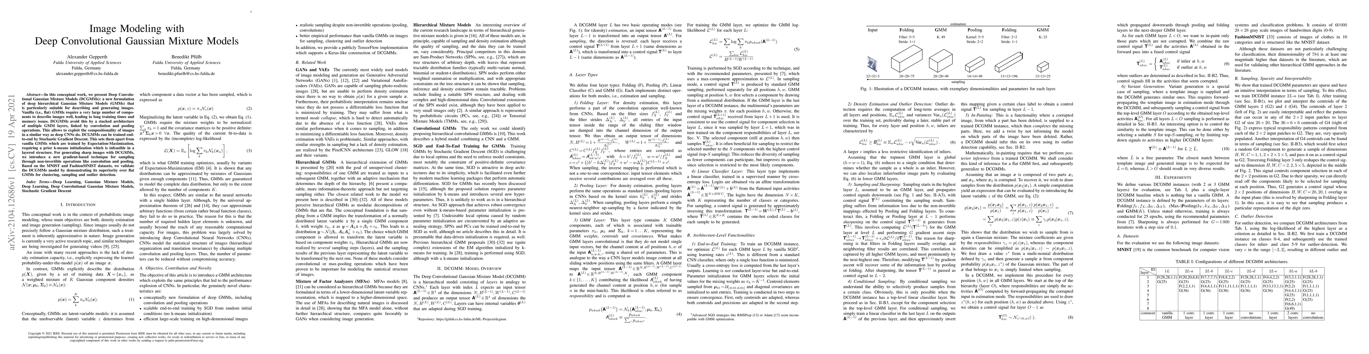 This paper introduces Deep Convolutional Gaussian Mixture Models (DCGMMs), a novel stacked architecture of convolutional GMM layers that efficiently describe and generate images. Unlike traditional GMMs, DCGMMs leverage convolution and pooling to exploit image compositionality, enabling end-to-end training and superior performance in clustering, sampling, and outlier detection.